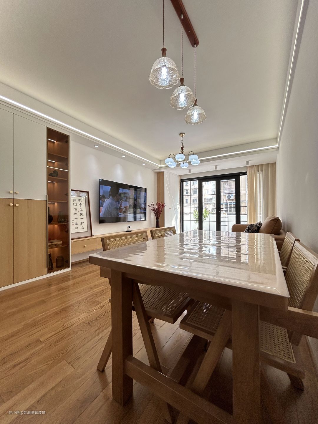 客餐一体,胡桃木的质感,精致又温暖,生活的享受从每一餐开始,从睁眼看到家每一角落开始。
