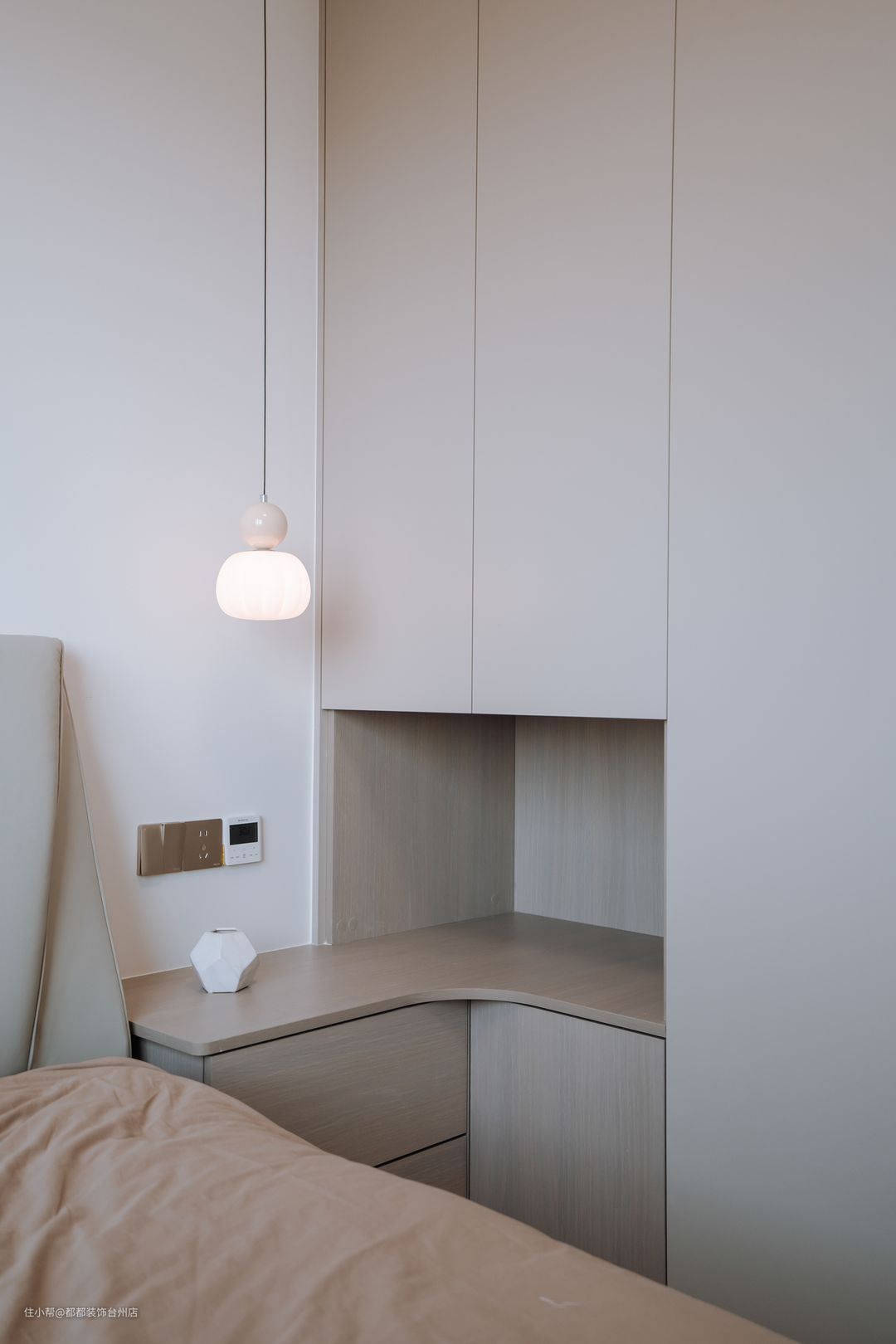主卧采用了石膏线条装饰,洁白的墙面与暖色的人字拼贴地板相得益彰。暖白色的床品在温馨的灯光下,显得格外舒适。 灰白色的双人床搭配白色床品,营造出宁静沉稳的睡眠空间。床头柜极具风格,长形吊灯和精致摆件的点缀,让小角落也自成一景。床边的定制到顶衣柜,提升了收纳效率,白色柜门与金色把手的设计,保持了卧室的柔和感。