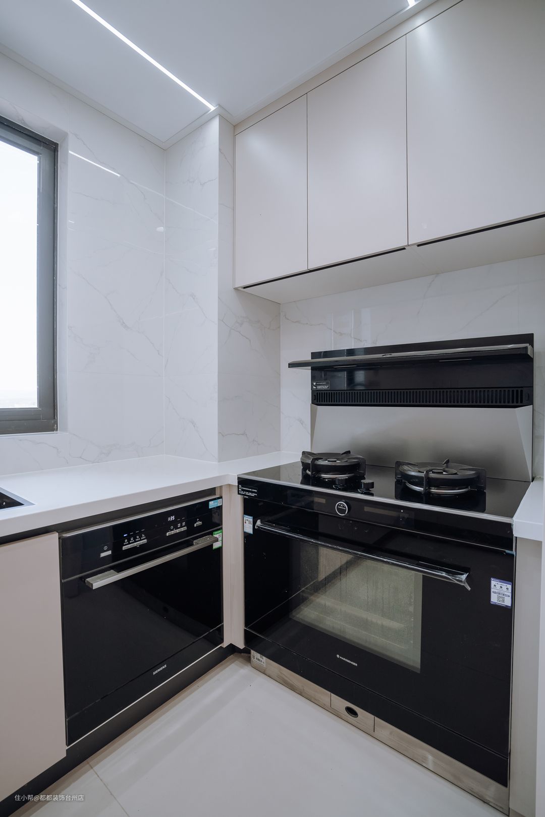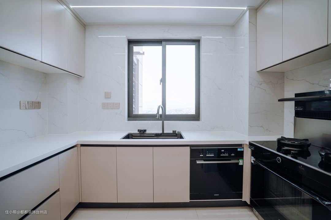 厨房采用三联动白框玻璃移门,增大进出空间,增强空间通透性。U 型厨房结构,科学划分操作区、洗菜区和烹饪区,动线流畅。奶白色橱柜提供强大储物空间,轻松收纳锅碗瓢盆,嵌入式煤气灶、洗碗机和消毒柜设计,让空间更整洁。