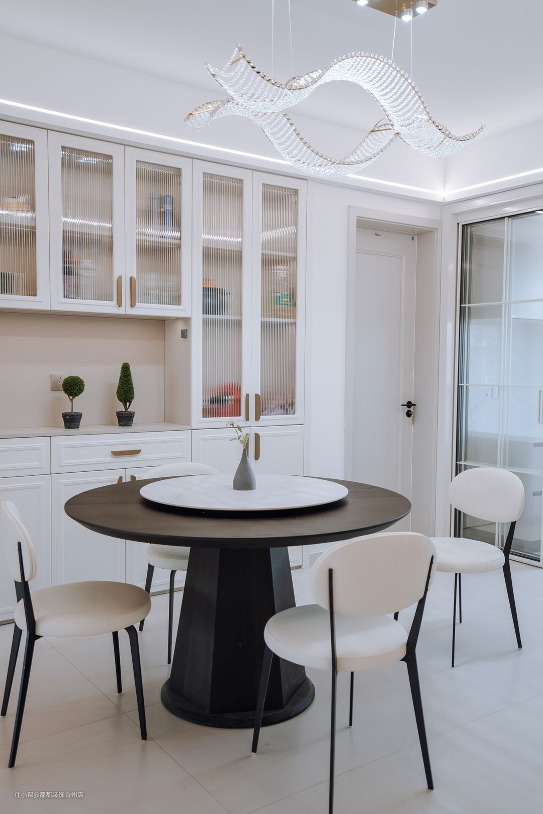 冰箱安置在餐厅角落,紧贴墙角,不影响厨房和餐厅的正常出入。白灰黑双层圆形旋转餐桌搭配白色餐椅,使用餐更加便捷。当有客人来访时,也无需担心夹菜问题。 波浪形水晶吊顶与桌上的鲜花相互映衬,为用餐增添了华丽与温馨的氛围,更显高级。餐厅一侧定制的白框玻璃柜子,加上开放格和封闭式柜子的设计,美观又实用,兼具储物和展示功能。