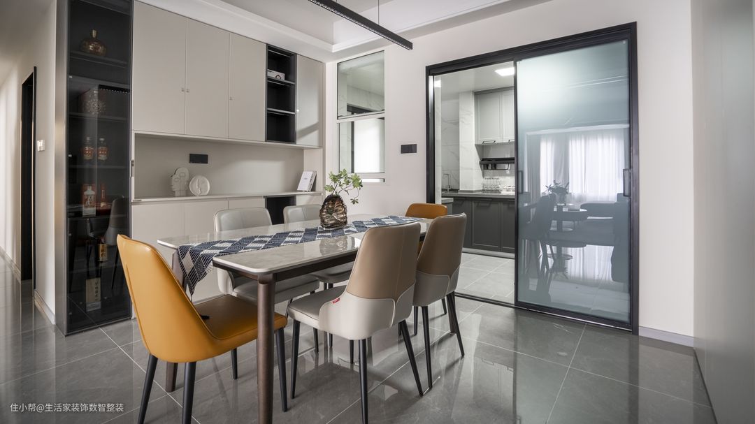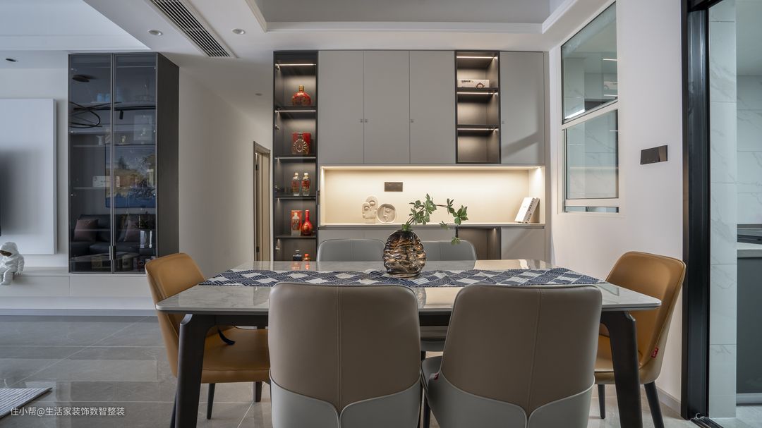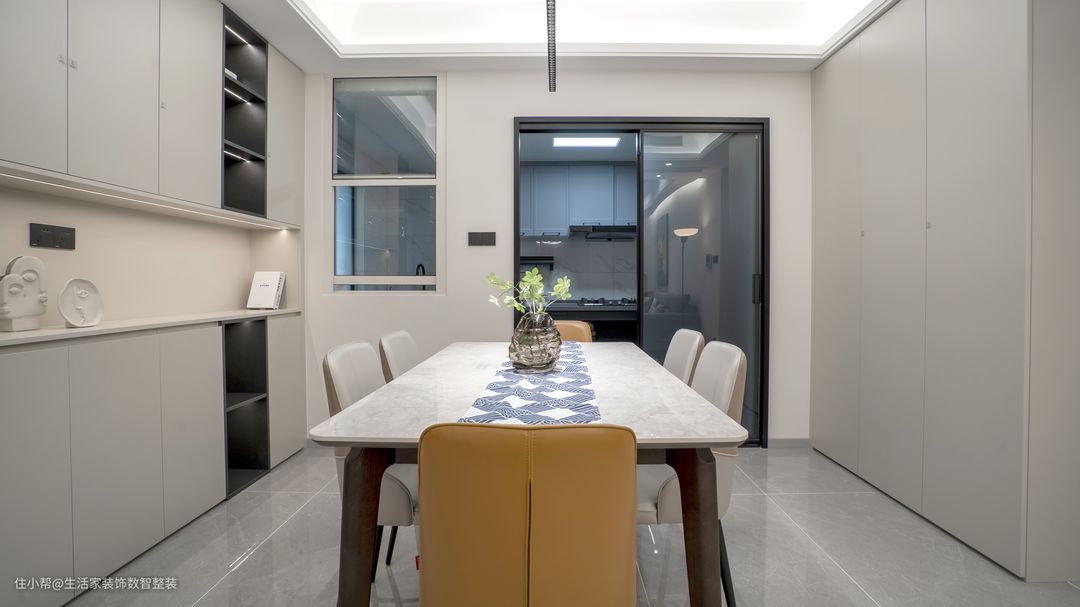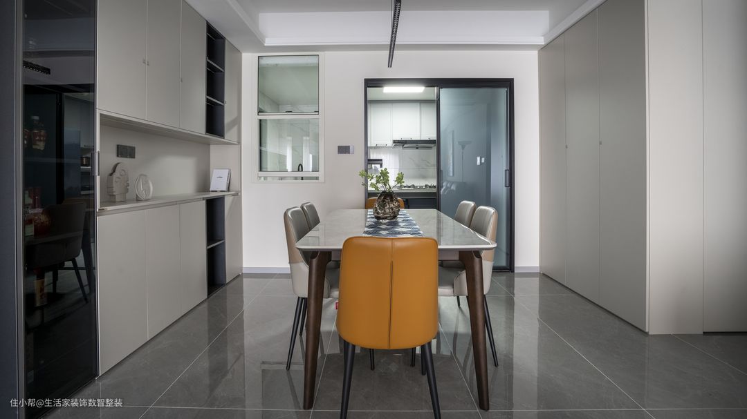 餐厅设计简单实用,长方形的餐桌留出过道的位置,不占用太多空间,符合实际需求。一面墙的餐边柜代替空墙既美化空间,又提升实用性,方便屋主收纳。