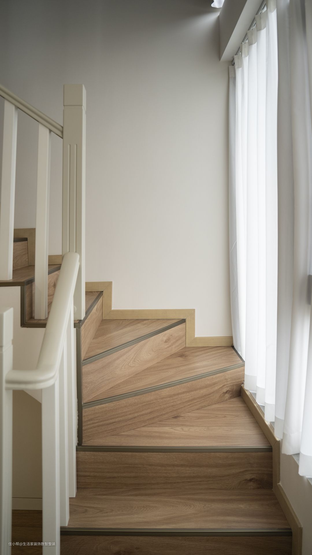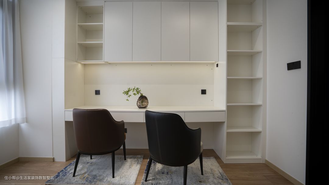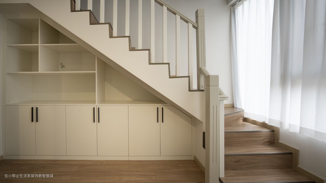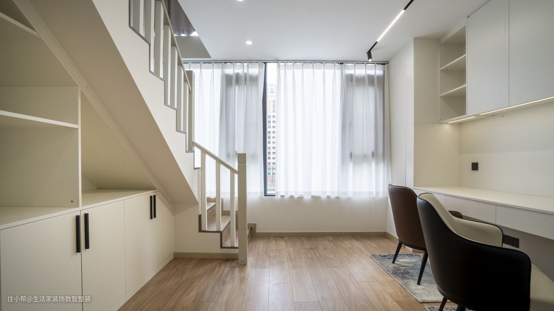 楼梯下的空间比较鸡肋,贴合空间做定制收纳,既起到装饰作用也创造出更多收纳空间,真是一举两得!另一面墙的书桌柜组合,可做临时办公区,未来有孩子也可规划为孩子的学习区。