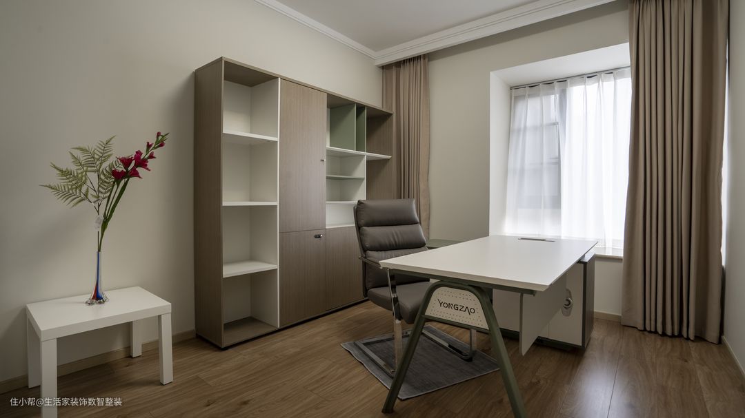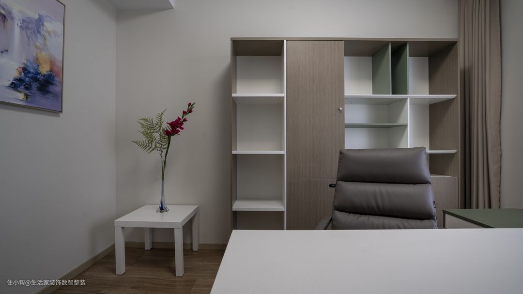 书房设在二楼,能为主人提供一个更为安静思考的空间,这里不用多豪华的设计,简单的一张书桌椅+收纳柜就足矣。