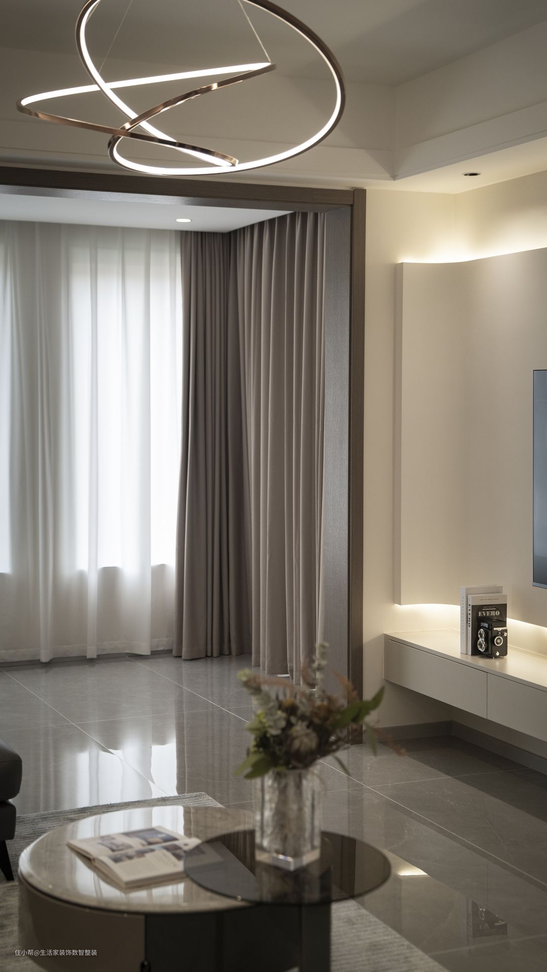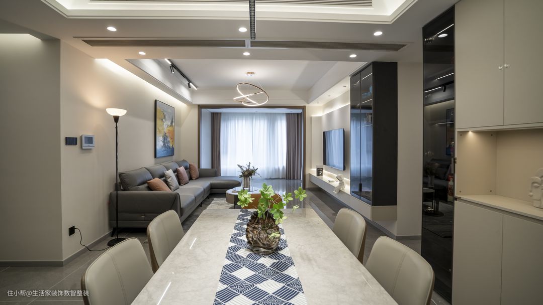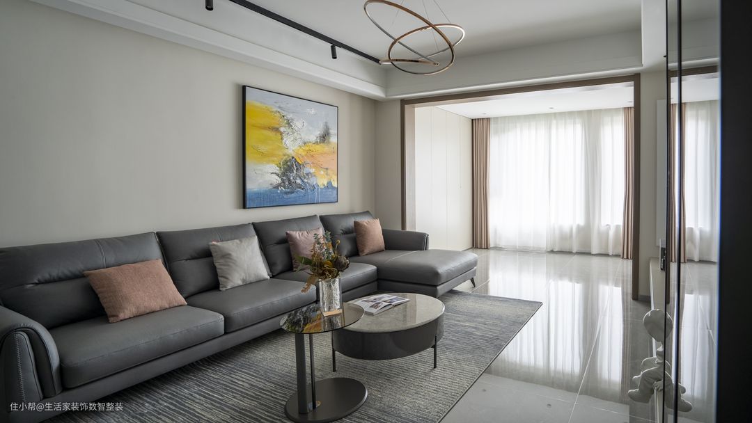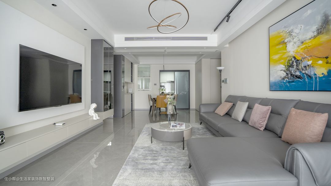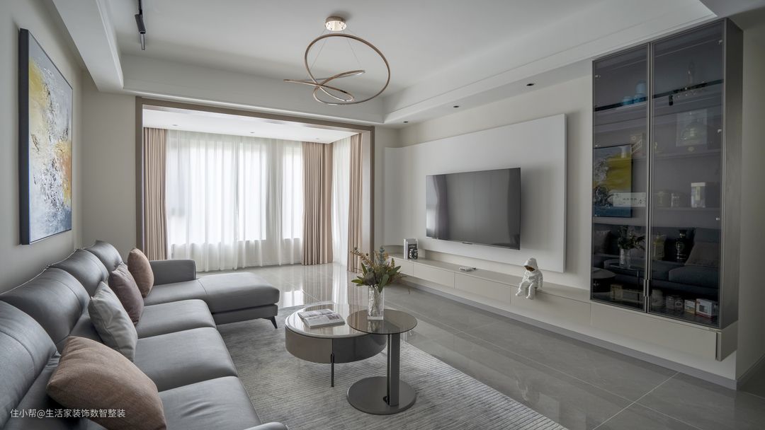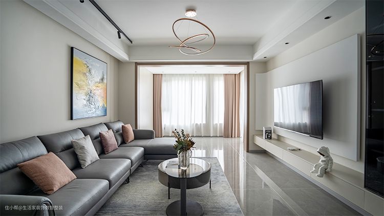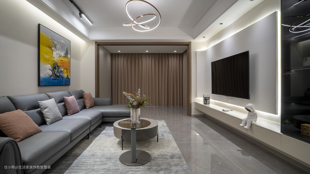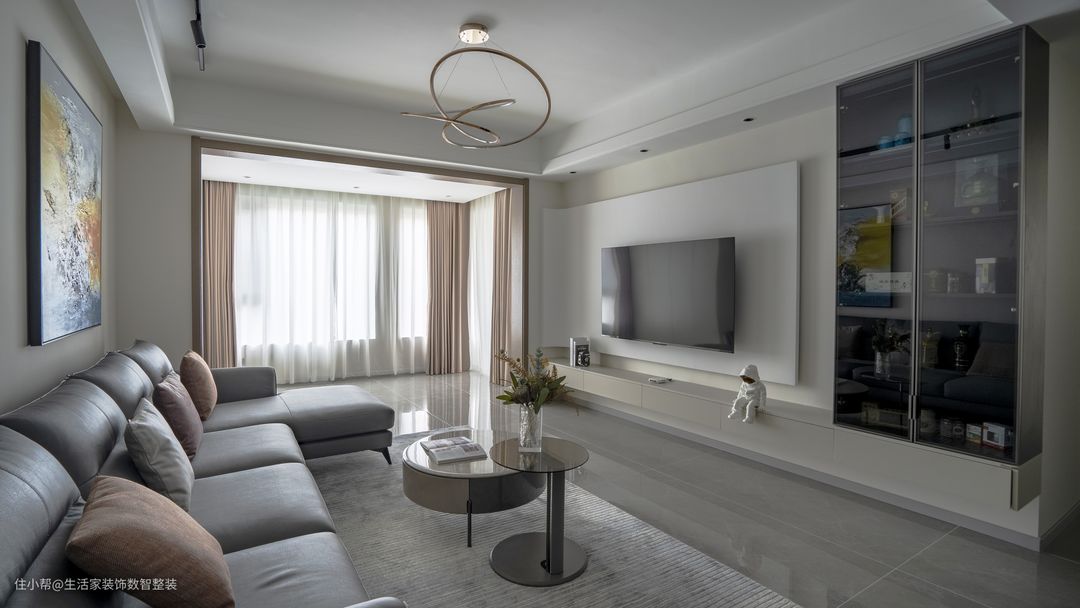 本案空间以质感灰、白色为主调,透过不同的材料质感及空间体块,让空间呈现出简单的层次感。 客厅以质感灰、白色为主调,透过不同的材料质感及空间体块,让空间呈现出简单的层次感和低调简约的基调。看似简约的沙发造型,不同深浅的抱枕色泽使得层次丰富多变,茶几造型独特,看似随意,却迎合轻松的会客厅氛围。 男业主喜欢积极向上的居家环境,光是他生活的重要组成部分,南北通透的自然光让整个室内充满阳光的气息。 客厅主灯与背景灯带从3000k到6000k的色温可通过Wi-Fi随意调节,在不同需求下获得最惬意的光源。