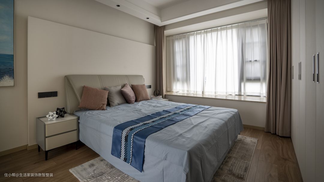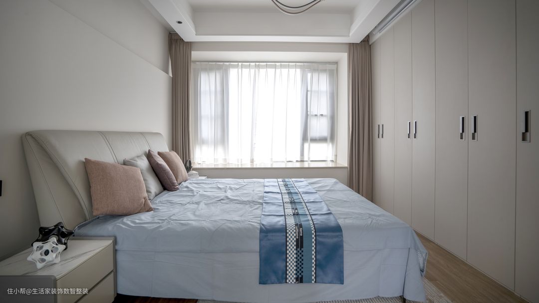 主卧的整体配色上选择了以灰色为主,从现代时尚感出发,营造一个理性的睡眠空间,呈现出专属于屋主的个性。 卧室床头背景墙利用护墙板及灯带,勾勒出床的摆放区域,正中心陈设一张软包双人床+床头柜,搭配一幅装饰画点缀,整体氛围即简洁又温馨舒适。一柜到顶的整体衣柜,让墙面更富有层次与质感,收纳力max。