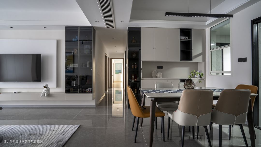 客户是一位未婚男士,做互联网工作,与父母同住,主卧需要属于自己的衣帽间,书房,整体风格简约大气,喜欢灯光打造的氛围感,注重灯光效果....... 方案以黑白灰为主,软装装饰部分爱马仕橙点缀空间,让空间更有层次感,利用灯光营造出整体风格的氛围感。 电视背景主要以石膏板,玻璃镜柜为主,线条简洁。整体采用浅色木饰面加线性灯搭配,墙面采用浅咖色乳胶漆,形成一个材质碰撞,使的整个空间层次更丰富。 厨房到餐厅的窗户为后期的使用融会贯通,功能分布明确的同时又有了家庭互动,加上推拉门的透视使客餐厅从视觉上更大气。