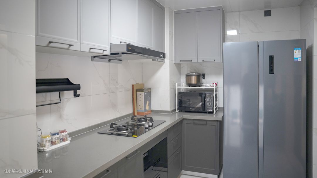 厨房设计完美规避原有承重柱对空间的局限,定制的橱柜通过地柜、吊柜对柱体外空间完美“填充”,对梁柱进行有效规避,弱化其空间压力,还提供更多收纳空间。