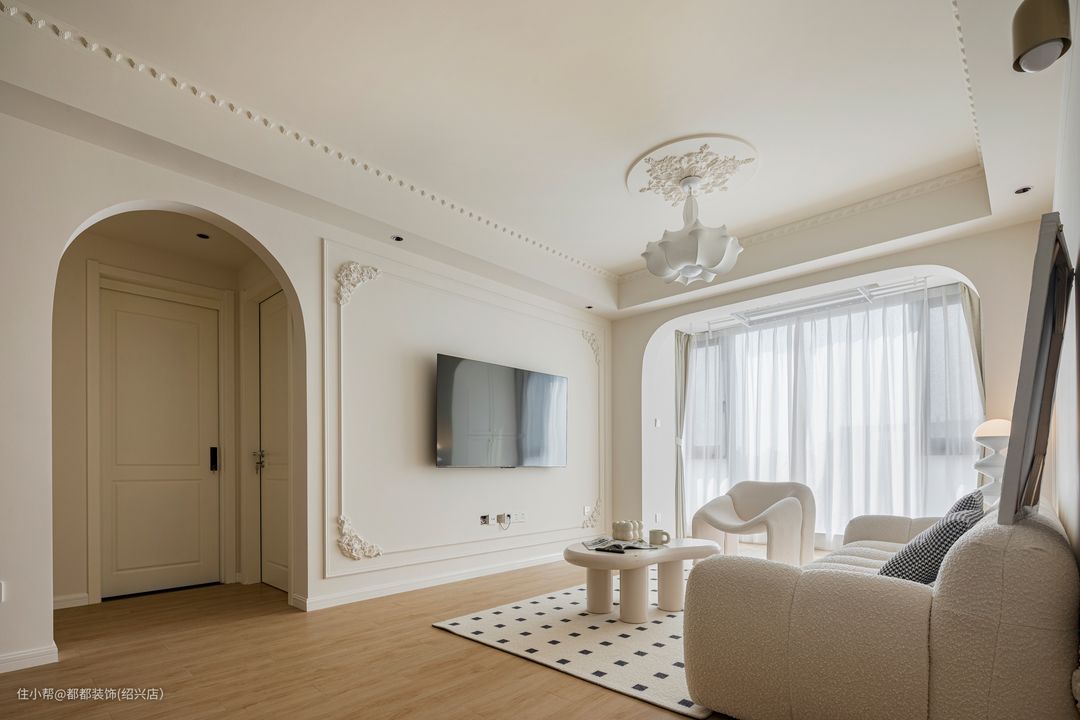 客厅的法式奶油吊灯犹如璀璨明珠,照亮了整个空间,展现出东方的典雅韵味。吊灯的蓬蓬造型仿佛在空中舞动,充满了活力和张力。石膏线沿着墙顶延伸,营造出高挑的视觉效果。电视背景墙的弧线过渡自然流畅,彰显着小法的独特风格。 通铺的地板与多处弧形元素相得益彰,让空间更显柔和与温馨。大面的落地窗引入明媚的阳光,使客厅明亮通透。绒布沙发柔软舒适,宛如云端坐靠,羊羔绒的纹理效果令人陶醉。 异型云朵茶几犹如飘浮的云朵,可爱而亲和。微笑椅的简洁设计带来愉悦的心情。绿植的存在让客厅充满生机,增添了清新与自然的气息。