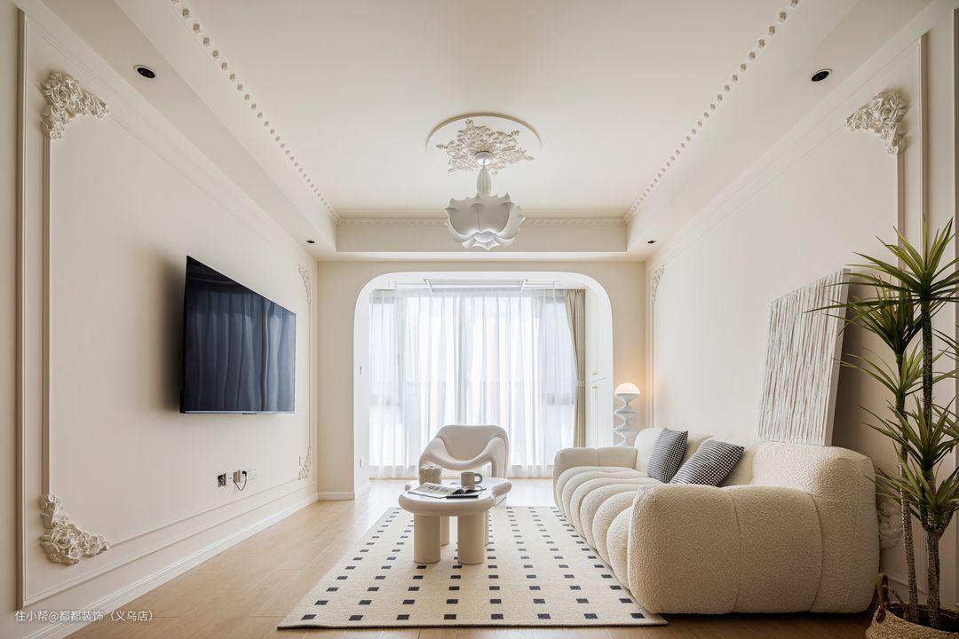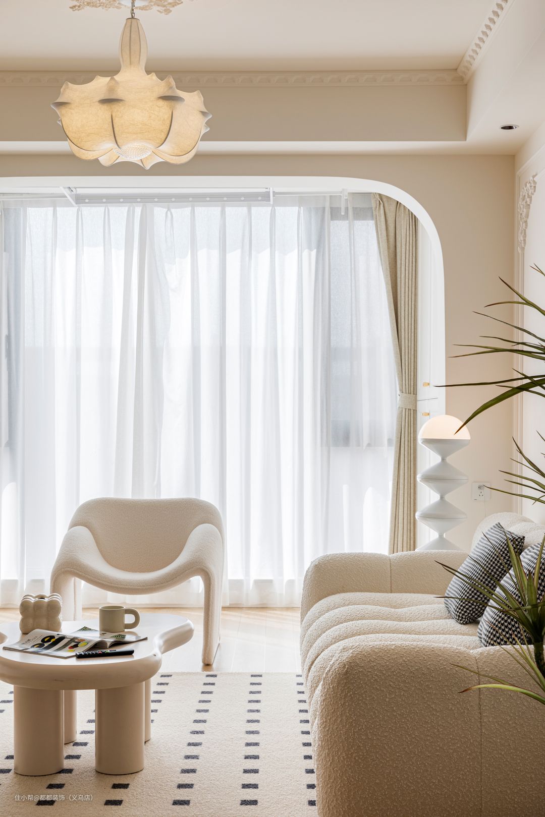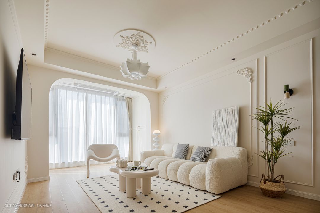 客厅里的法式奶油吊灯如同一颗璀璨的明珠,散发着东方的独特魅力。吊灯的蓬蓬造型仿佛一朵盛开的花朵,充满了张力和生机。石膏线沿着墙顶游走,为空间增添了高度和立体感。电视背景墙的弧线设计巧妙过渡,展现出小法的浪漫风格。 通铺的地板与弧形元素相互呼应,营造出温馨柔和的氛围。大面的落地窗让阳光尽情涌入,照亮了整个客厅。温软的绒布沙发提供了云端般的坐靠体验,羊羔绒面料的柔软触感让人陶醉。 异型云朵茶几的 Q 萌造型带着一份童趣和可爱,流畅的曲线设计避免了磕碰的危险。懒人微笑椅以简单利落的外观给人带来轻松愉悦的感觉。绿植的存在为空间注入了生机与活力,提升了家的温馨气质。