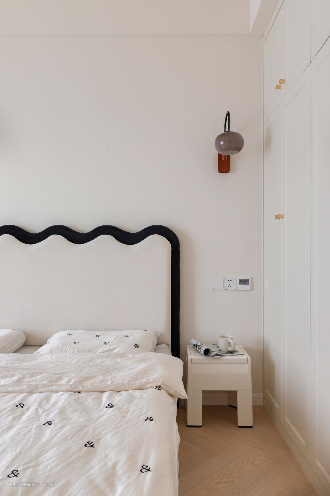 主卧的软包床头以云朵奶油系为主题,简约与实用性俱佳。卧室是一天的起止点,是抚慰心灵、展现个性的地方;是卸下疲惫的歇息处,更是艺术灵魂的飞翔地。 床头放置了实用的小巧矮凳,兼具坐凳和储物功能。这一小小的改变让家居生活变得更加生动有趣。“柿子”造型的灯具悬挂在灯体上,极具设计感和故事性,在提供照明的同时,为空间增添了一份趣味和温暖。