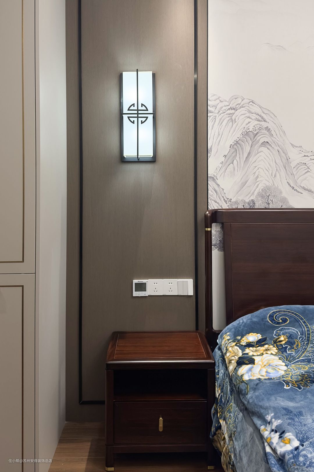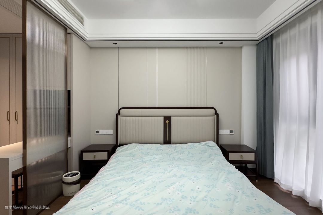 空间装饰采用简练硬朗的直线条,让新中式卧室看起来更具实用现代感。