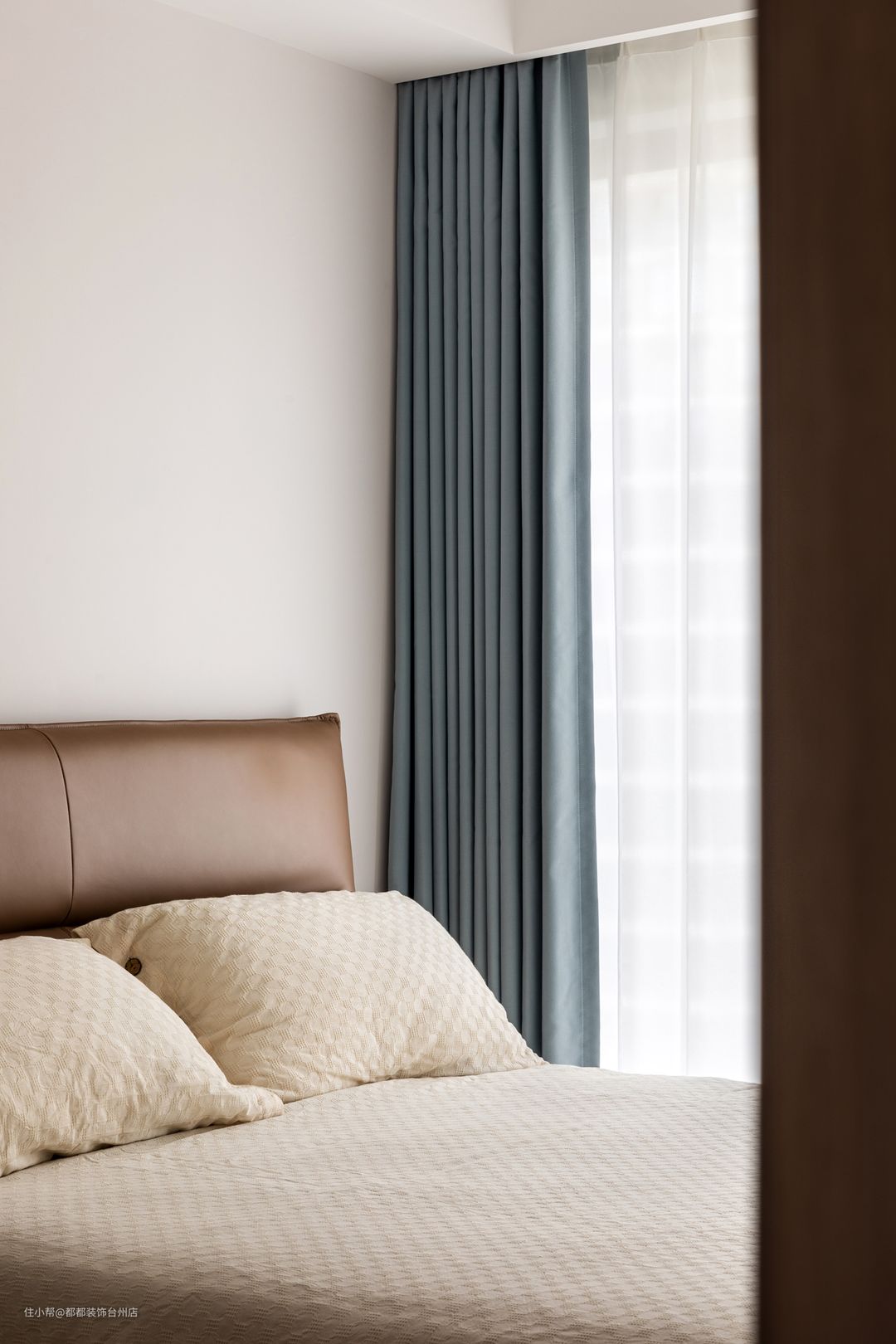 男孩房与女孩房的设计大部分一致,不过将窗帘换成了蓝色,蓝色象征着大海和天空,有一种纯净的感觉。卡其色的大床结合米色床品,优雅的色调表达出温和的氛围;温润的原木地板与书桌色调一致,为整个空间增添了一丝自然暖意。