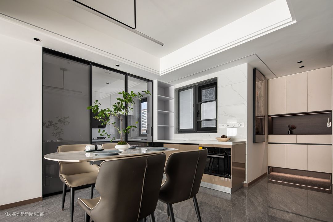 利用黑色玻璃推拉门将厨房和餐厅做隔断,不仅避免油烟问题,又能确保光线的充裕。 靠窗的储物柜从厨房延伸出来,让餐厨保持很好的整体感;同时利用白色开放格做了餐厨位置隔断,摆上精致的物品,增添更多调性。大理石的餐桌与皮质餐椅的搭配,为用餐区域增添一份温暖和舒适感,同时也展现了一定的设计感。 桌上的摆盘可以体现出主人的精致美,让美食不再是简单的吃与饱,而是一种享受。清新的绿植,为整个空间增添生机和活力,淡淡的芬芳气息,让一家人在用餐之际的心情更加愉快。