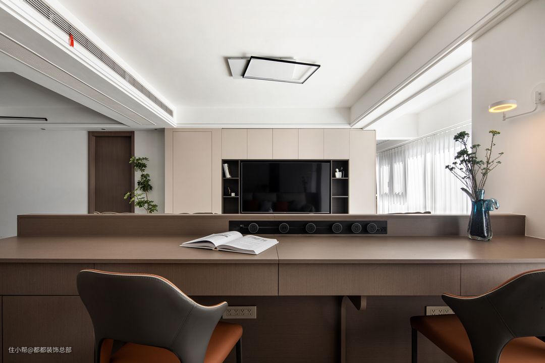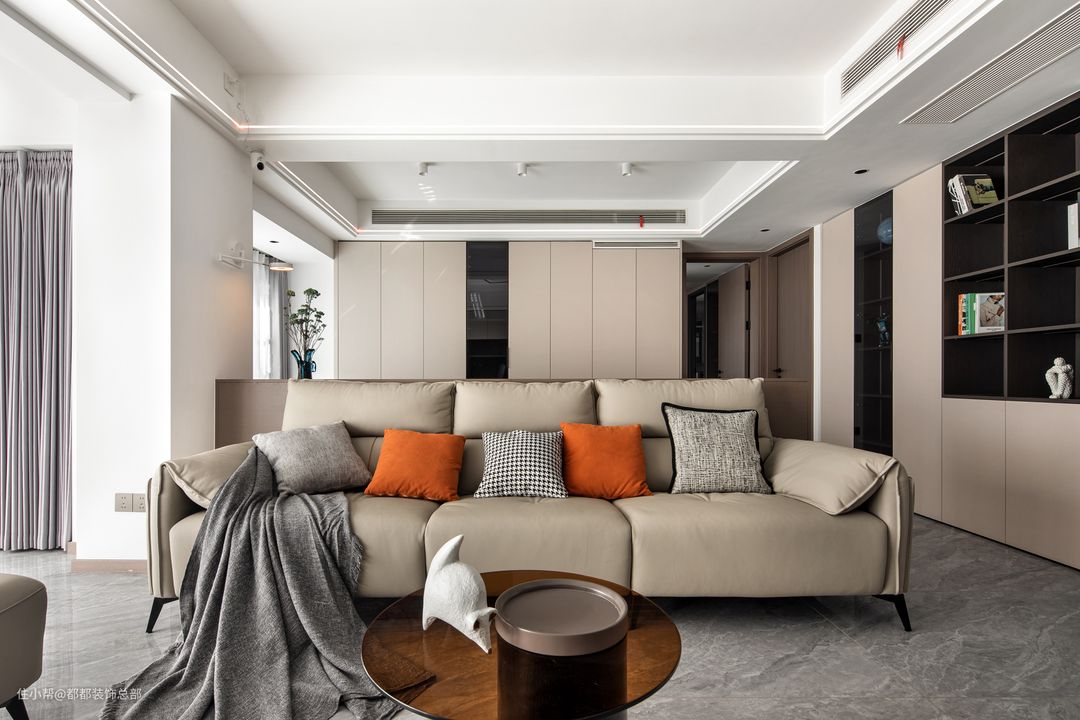 将阳台纳入客厅,扩大客厅的空间;整片的落地窗设计,在家就能感受窗外一年四季的美景,加上自带滤镜的轻薄白纱,为整个空间增添一层极致的温柔。 客厅采用双眼皮吊顶设计搭配几何形状的主灯,提升空间采光度;结合四周的暖光设计,带来独特的氛围感。全屋通铺灰色的地砖,简约大气,轻松营造出端庄自然的空间感,结合上舒适雅致的米色沙发,呈现出温馨轻松的惬意氛围。电视背景墙采用定制的轻奢灰柜子+黑色开放格搭配设计,增加收纳能力的同时,又有着非常不错的装饰效果。 通往女孩卧室做了隐形式的房门设计,十分巧妙,与电视柜融为一体,让人感觉不到它的存在。沙发后隔出个小书房,定制深米色系的书桌,大人小孩均可在这办公学习,加强家人之间的交流。一旁的飘窗摆上鲜花绿植、抱枕蒲团,泡杯咖啡,学习累了可以在这儿放空一下。