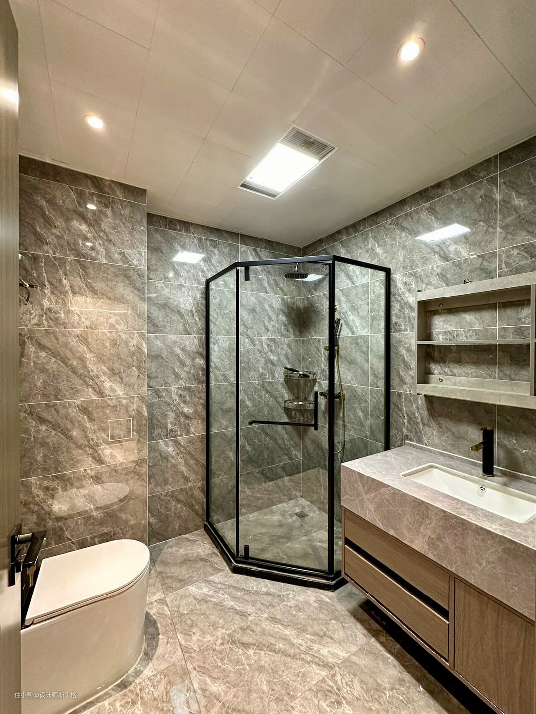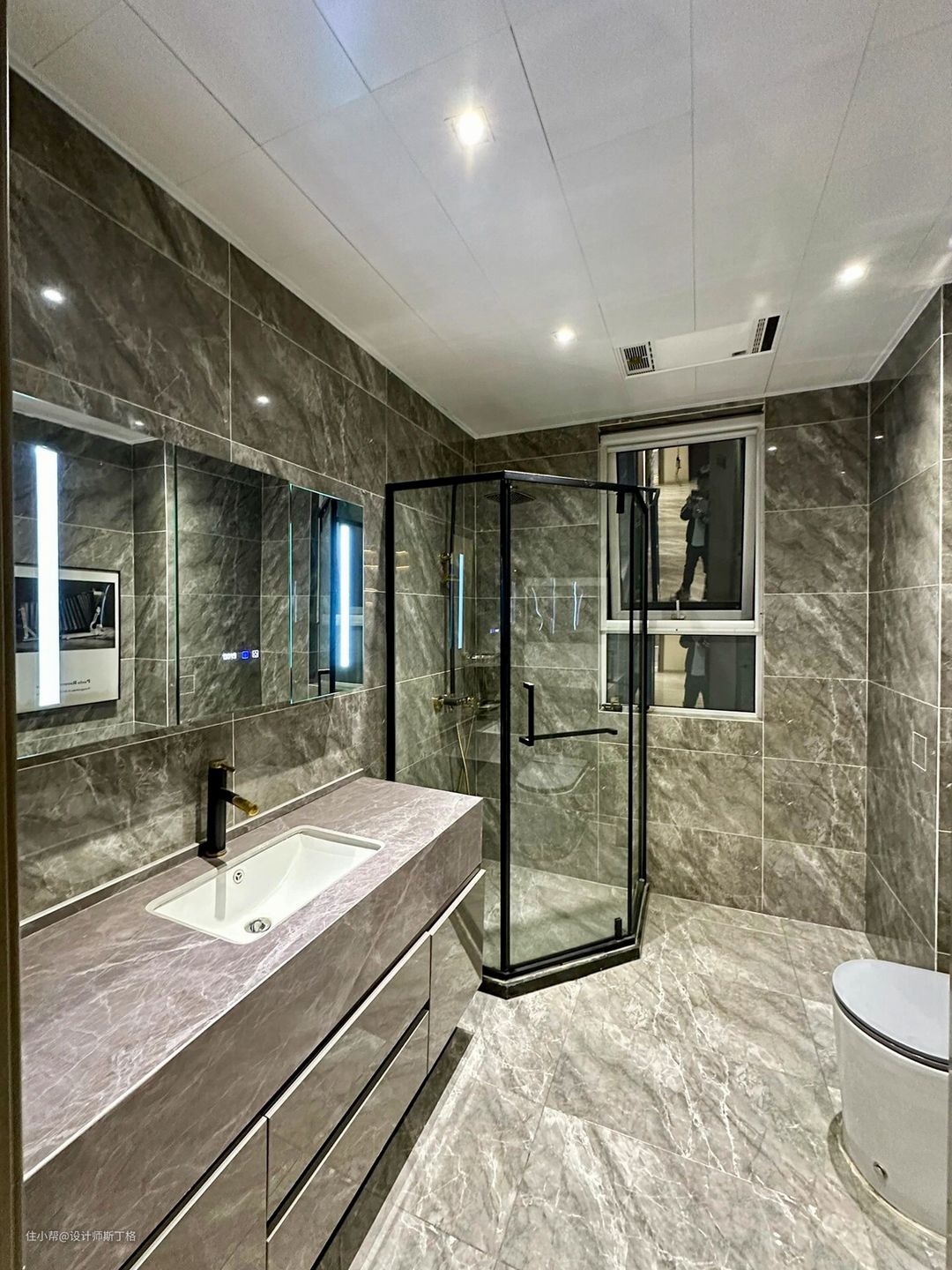 卫生间采用灰色大理石瓷砖的墙壁和地板,让整个空间显得高级感十足。👑 玻璃淋浴间采用了黑色边框,既增添了神秘感,又让整个空间显得更加宽敞明亮。