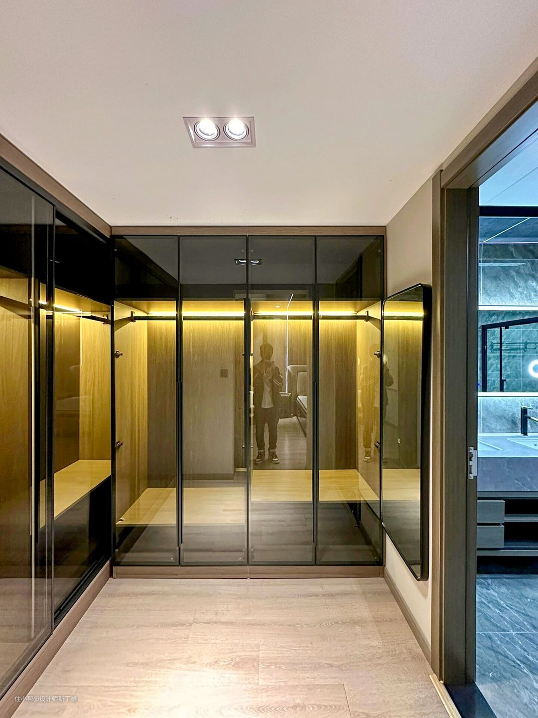 👗👠 首先,映入眼帘的是那排黑色的玻璃门衣柜。黑色,代表着稳重与神秘,而透明的玻璃门则打破了沉闷,让人一眼就能看到里面的衣物和配饰,整齐又方便。 🎨 整个衣帽间的色调以浅色为主,给人一种宽敞明亮的感觉。墙面和地板的色调搭配得恰到好处,既不会过于刺眼,又能营造出一种温馨舒适的氛围。