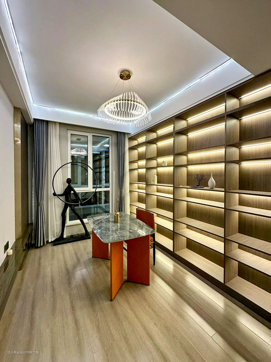 🌈🏠书房采用的是暖色调的基调,让人感觉温暖而舒适。 🎨🖼墙壁和天花板上的金色装饰线条灯,仿佛给空间披上了一层奢华的面纱,显得既高贵又不失雅致。