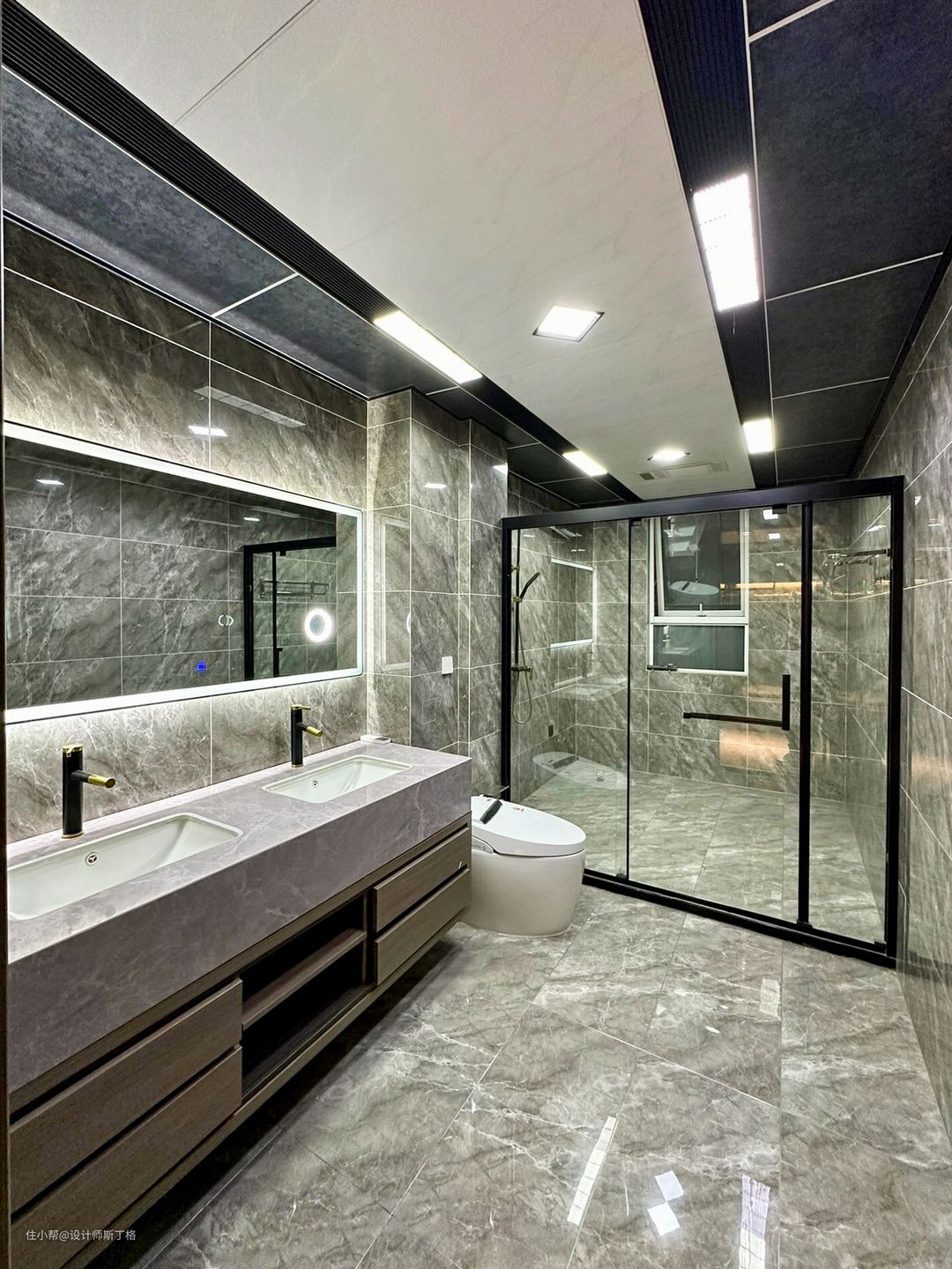 🌈卫生间采用灰色与黑色的主色调,让空间显得既低调又不失奢华。大理石纹理的瓷砖,从墙壁延伸到地板,不仅提升了空间的质感,更给人一种干净整洁的视觉享受。 💦双水槽的设计,满足了日常洗漱的需求。 🚿最吸睛的莫过于那个大型的玻璃淋浴间。透明的玻璃设计,让空间更加通透,也增加了视觉的延伸感。黑色的淋浴头,更是提升了整个淋浴间的品质感。 💡天花板上嵌入式的照明灯具,不仅提供了充足的照明,更为整个空间增添了一丝现代感。