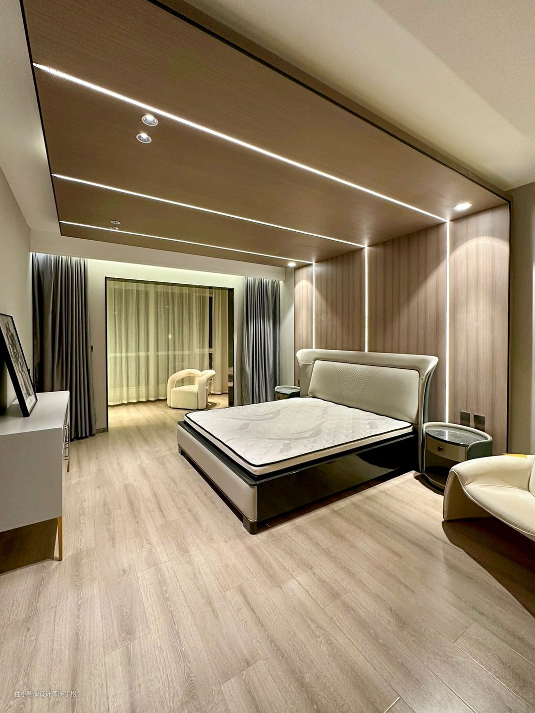 其次,灯光的设计也是亮点。长形的LED灯条不仅提供了充足的照明,还营造出了一种柔和的氛围。在这样的灯光下,无论是阅读还是休息,都能让人感到舒适和放松。