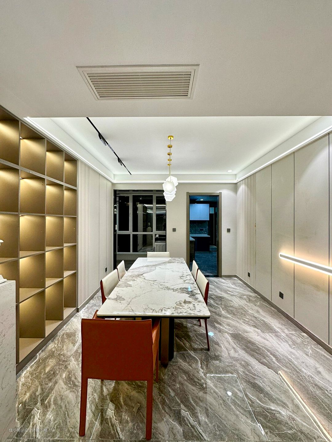 长方形大理石餐桌简约而大气,桌面光滑如镜,倒映出室内的光影。四把椅子分别采用红色和白色,色彩对比鲜明,给空间增添了活力。 💡嵌入式照明设备和壁灯为餐厅提供了充足的光线,营造出温馨舒适的氛围。 🌸大理石纹理的瓷砖地板,既防滑又耐磨,为餐厅增添了一抹豪华感。