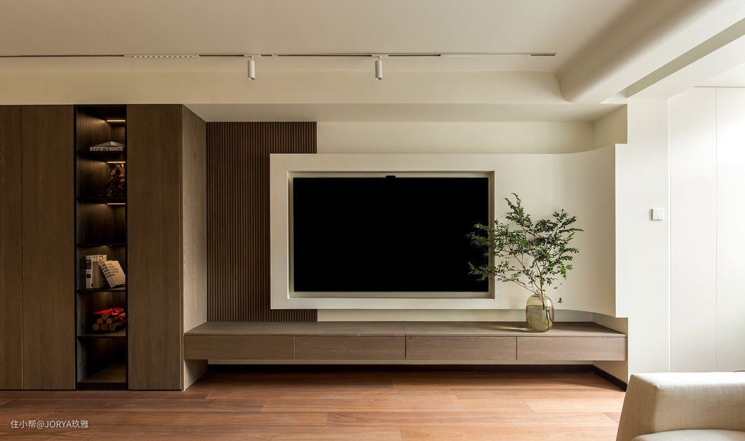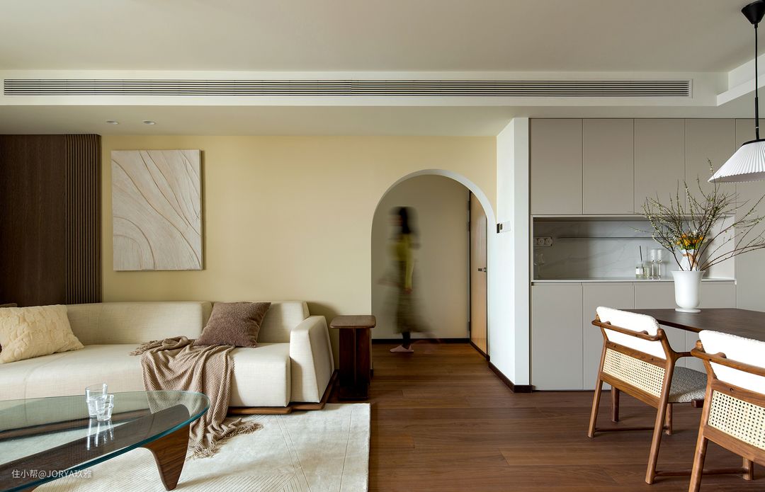 穿过餐厅,便是日常休闲的客厅了。浓郁的焦糖色为主调,搭配奶油色的墙面和深胡桃木色家具,高级感十足。 客厅低重心的浅色家具与柔和的色彩营造出的松弛感,让人窝进沙发里便能卸下一身的疲惫。 8.2米长的储物柜从玄关一直延伸到阳台,考虑到不同区域的功能和造型,我们将定制柜分成了三个部分,靠近玄关的满墙储物柜+一字型悬浮电视柜+阳台工具柜,这三个柜子严丝合缝的组合起来形成了一套完整的收纳系统。 开放格摆放用来展示的书籍和摆件,满墙柜子有藏有露,不会显得死板和压抑。 木栅格从柜子一侧延伸出来,很好的过度到墙面,视觉上也更显丰富。奶咖色弧形墙板+隐藏式灯带结合的形式,与吊顶圆弧相呼应,让空间显得更加立体、更有层次。