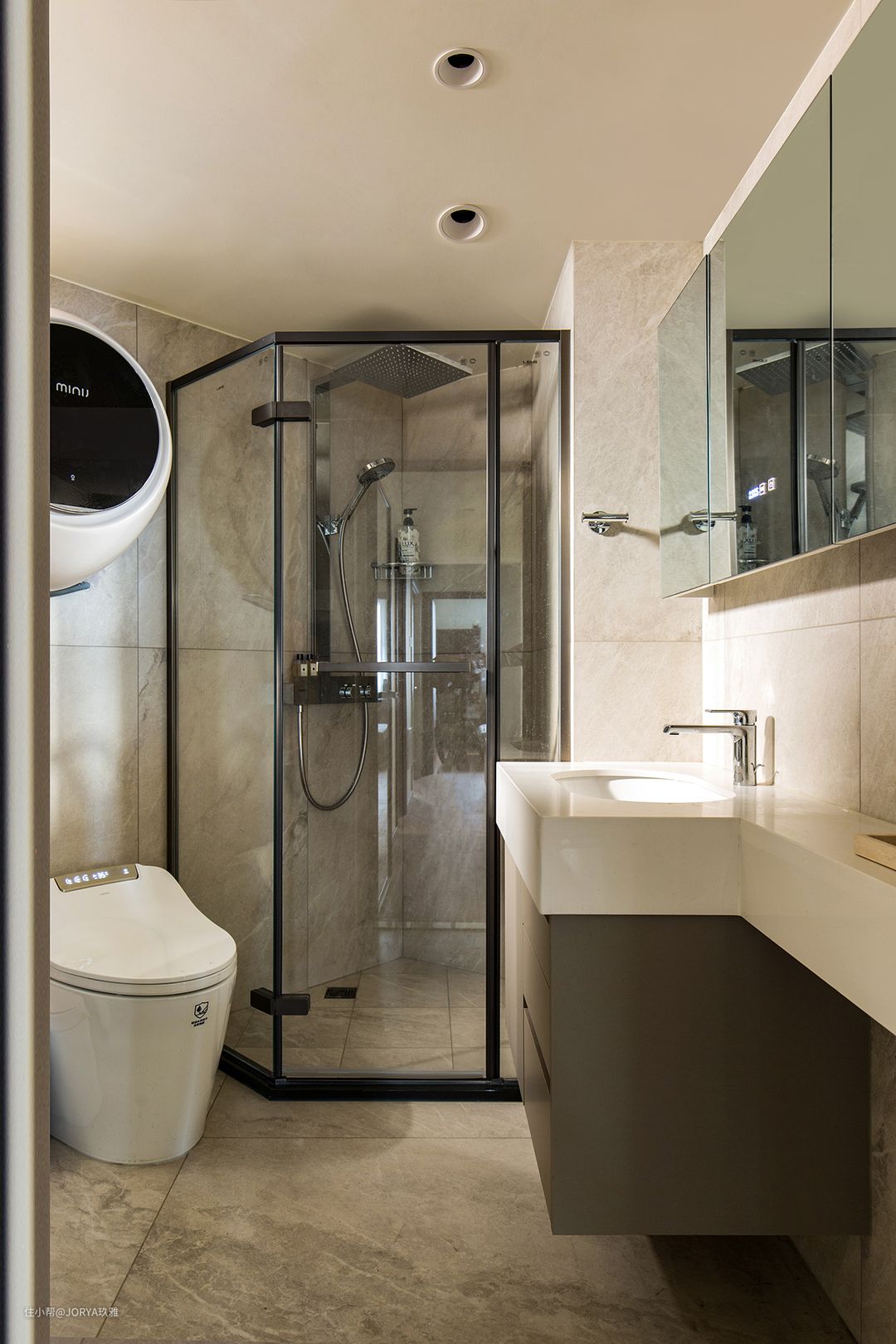 穿过拱形门洞,右手边就是次卫。 异形空间二:次卫 长虹+磨砂的双层玻璃门,透光不透人,很适合这里。 次卫离阳台晾衣区更近一些,所以我们把洗衣机和烘干机都放在这里,沿墙来布置。 同样异形的钻石淋浴房进一步修饰了空间,洗手池和马桶紧挨着淋浴房,但不影响淋浴房开门,尺寸拿捏的刚刚好。 次卫的现代都市风是男业主喜欢的。整个卫生间虽然看着满满当当,但是摆放有序,互不干扰。