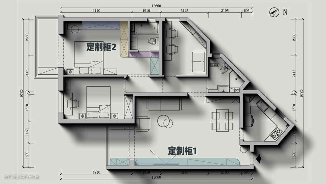 结合屋主的需求,我们做了以下调整: 1、改变主、次卧门洞位置,将部分走廊闲置空间纳入主卧。次卧门洞向屋内移动,为改成女屋主喜欢的双开门形式预留空间,将卫生间和走廊闲置空间包进主卧内,这样主卧就变成了一个功能齐全的大套房。 2、两组8米多的超长定制柜满足家中大部分收纳。定制柜1自玄关延伸至阳台,集玄关柜+电视柜+阳台工具柜于一体;定制柜2在主卧,柜子呈“M”型,用来收纳大部分衣物、鞋帽。除了这两个大型定制柜外,其他空间还有各自专属的收纳柜。改造后全屋储物占比达到:26%。 3、兼容两种不同的风格搭配。最大的区别在两个卫生间,一个现代都市风,另一个复古小清新。其他空间多以现代风格为主,选择温暖的配色,再在细节处点缀复古元素。