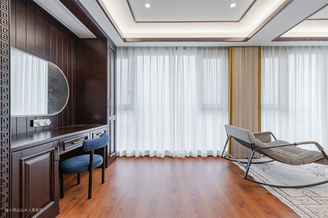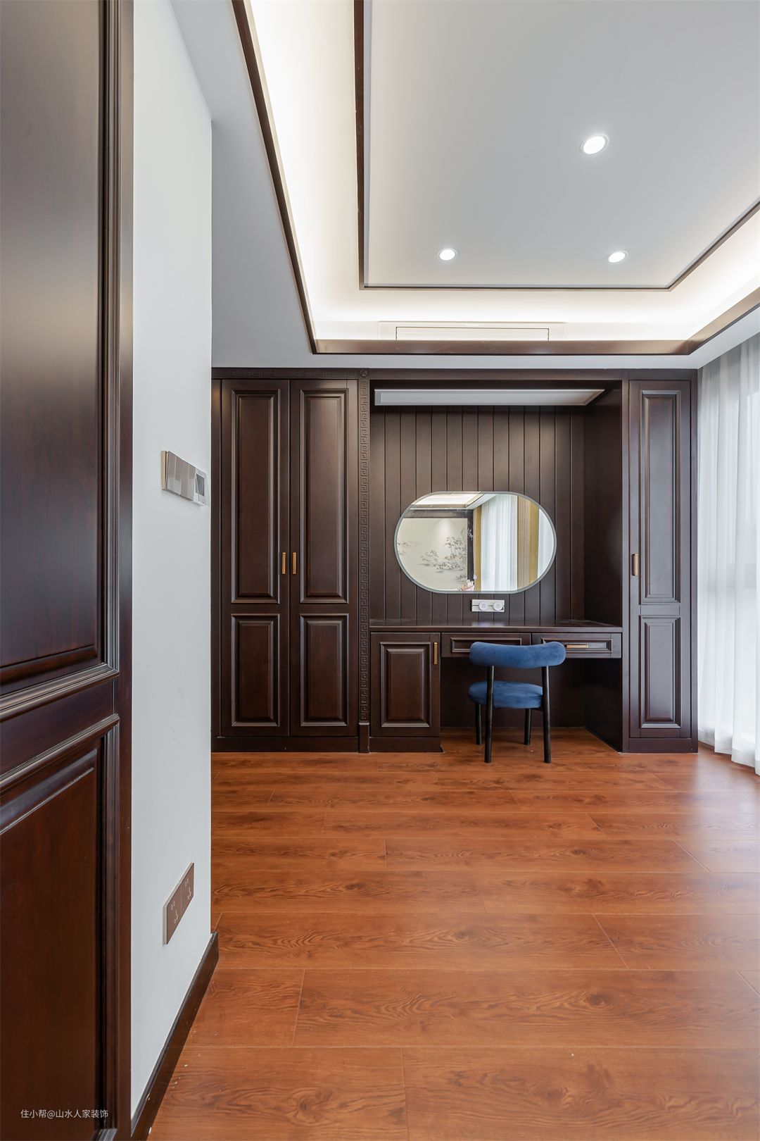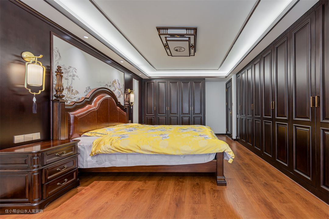 主卧实际上做成一个大的套间,里面玄机暗藏。通过保留了东方之意境和韵味,加上现代简洁风格的融入,整体融会贯通,创造出一个舒适安逸的睡眠空间。 主卧墙面是墙板+木饰面的组合,细节处的刻画让空间更显雅致。整体布局对称工稳,给人一种沉稳大气的感觉。古朴的床架结构搭配“黄马褂”,升腾出不少富贵气息。 主卧打造了较多的柜体,以此满足更多的储物实需。床尾位置则定制了一整面的衣柜墙,经典大气的实木柜面造型,更让人印象深刻。地面通铺深色实木地板,同周围环境碰撞出更多层次性。