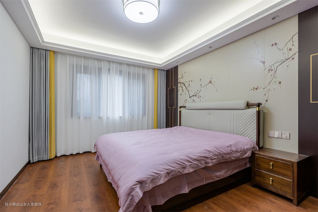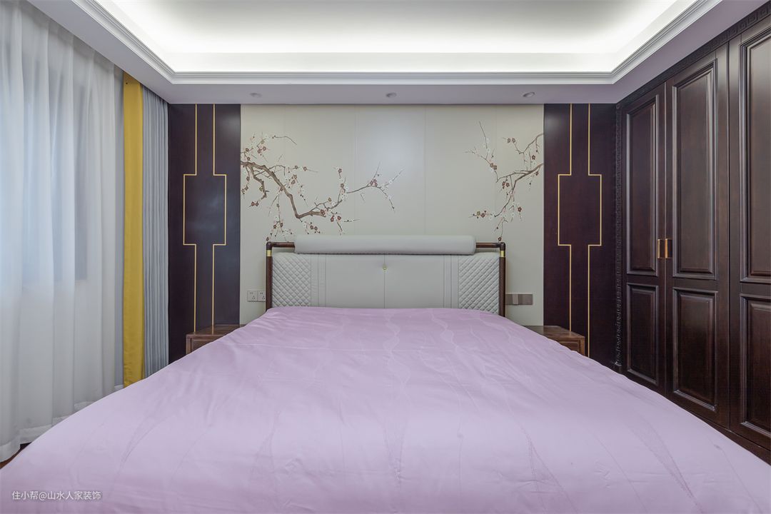 卧室背景墙则选用“傲雪寒梅”主题,以表达高风亮节的品行。联合木饰面,做了一体式的柜体造型。有道是“遥知不是雪,为有暗香来”,丰富的内饰让卧室充满亮点。