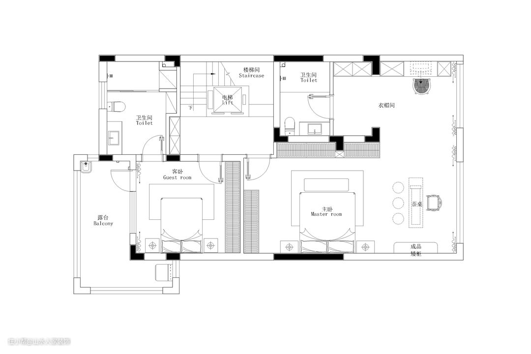 二楼是家里放松睡眠的场所,上过电梯后会来到一处休息厅。整体布置简洁大气,方正的吊顶造型,提升空间的层次感,这里作为一个过渡的休闲点,受到全家人的关注。