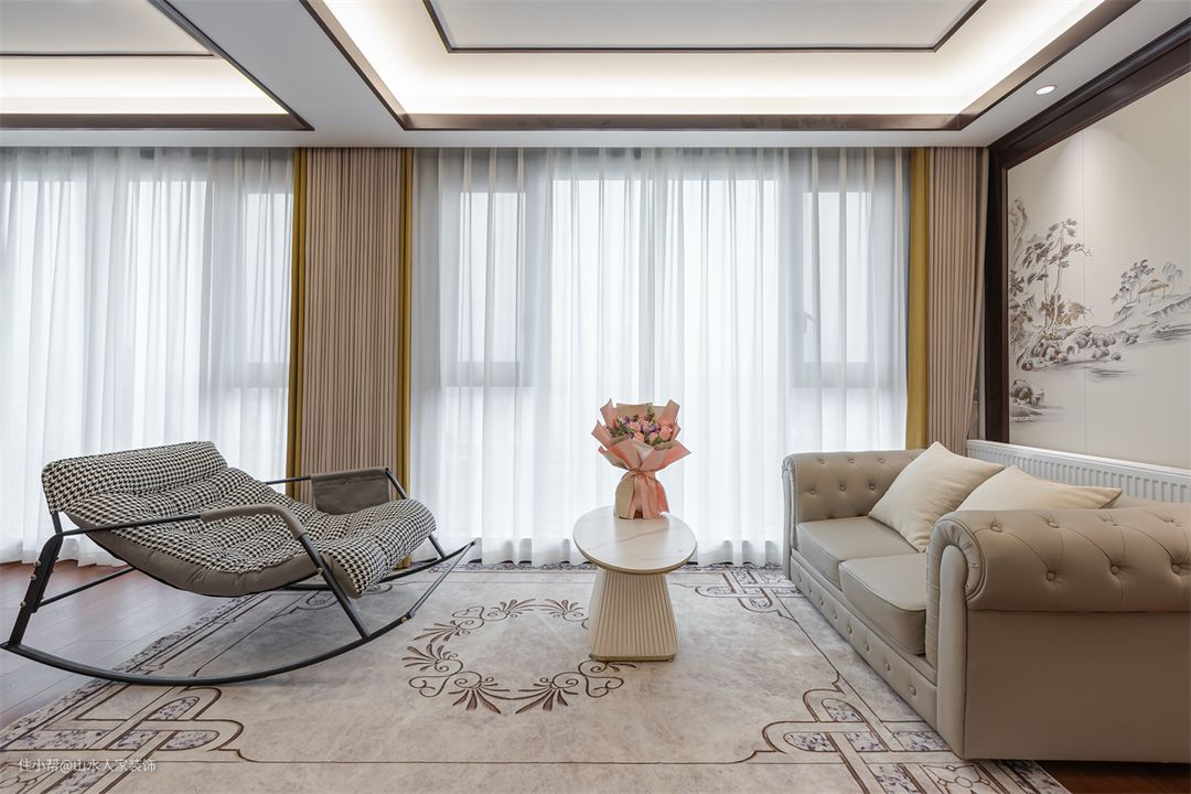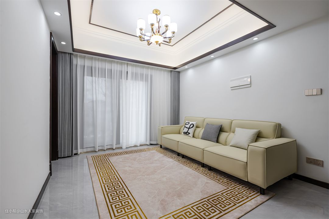 空间采光通透自然,选用轻薄的纱帘,兼顾了居室的隐私与透光性。豆腐块沙发规矩有型,靠感也格外舒适。搭配地面的中式花纹地毯,表现文化的深刻内涵。