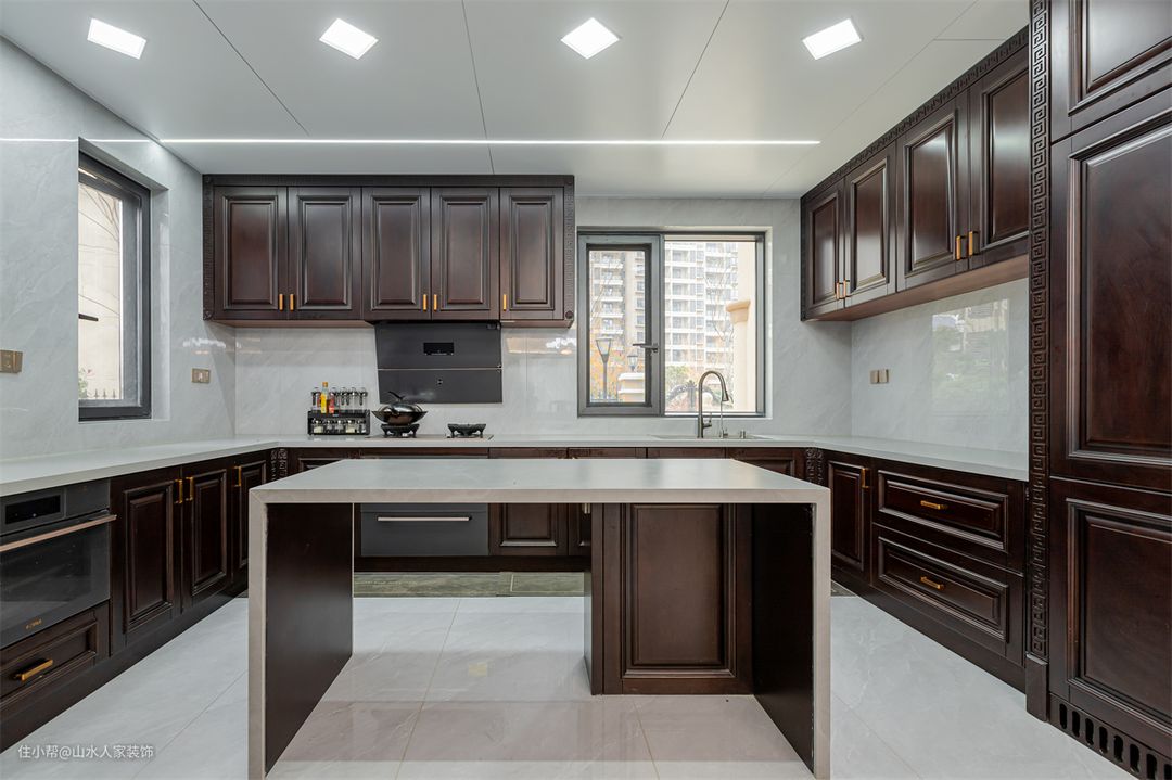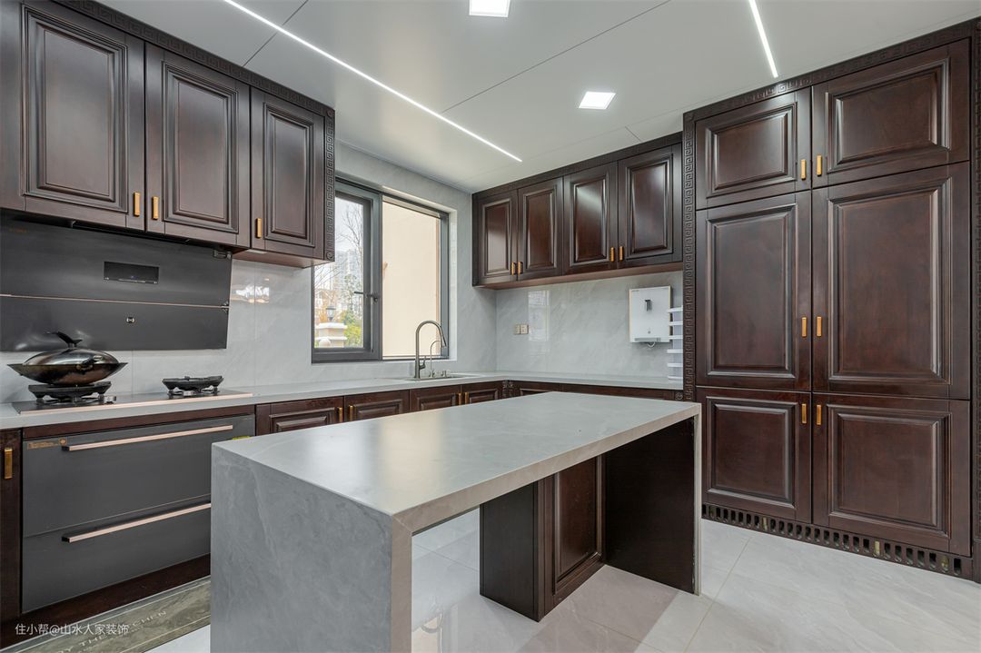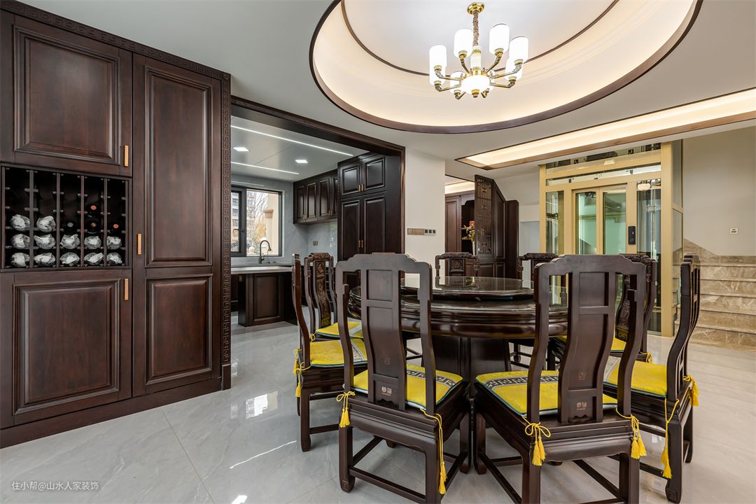 红木橱柜与餐桌属同色系,达成色调上的统一,进而让空间在视觉上成为一个整体,显得干净又整洁。内置现代化的烹饪设备,使用效率大幅提升,使中式风格完美融入餐厨生活。