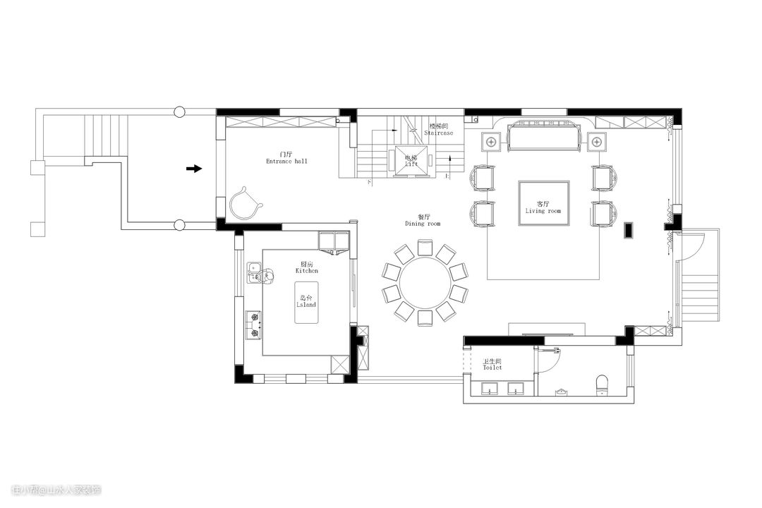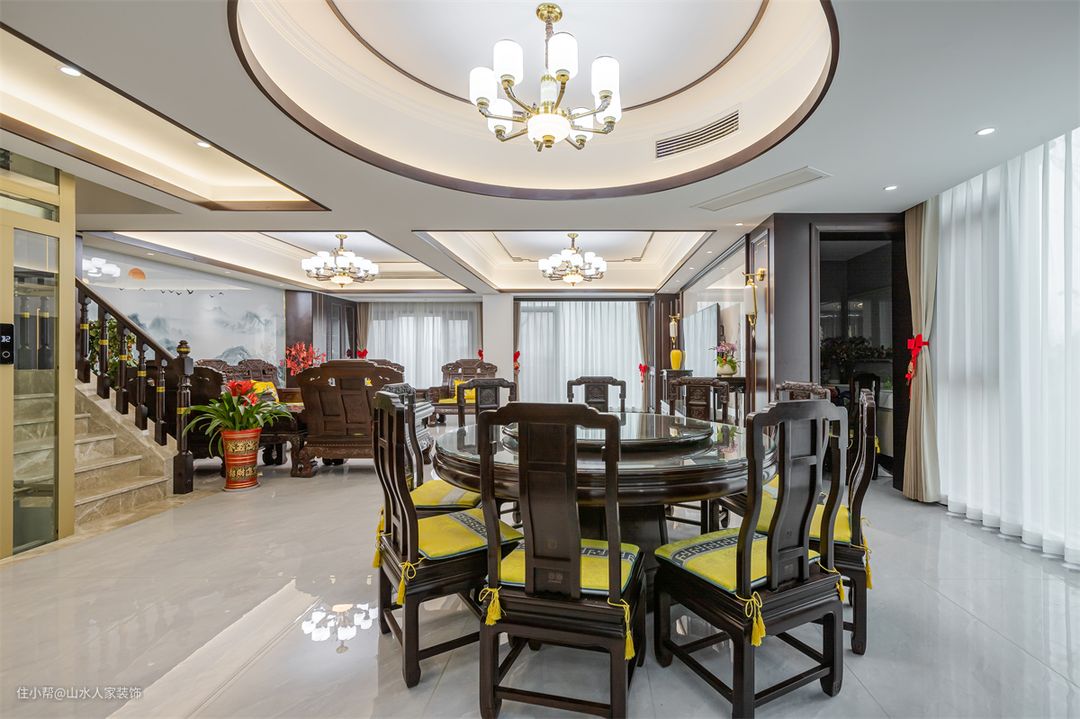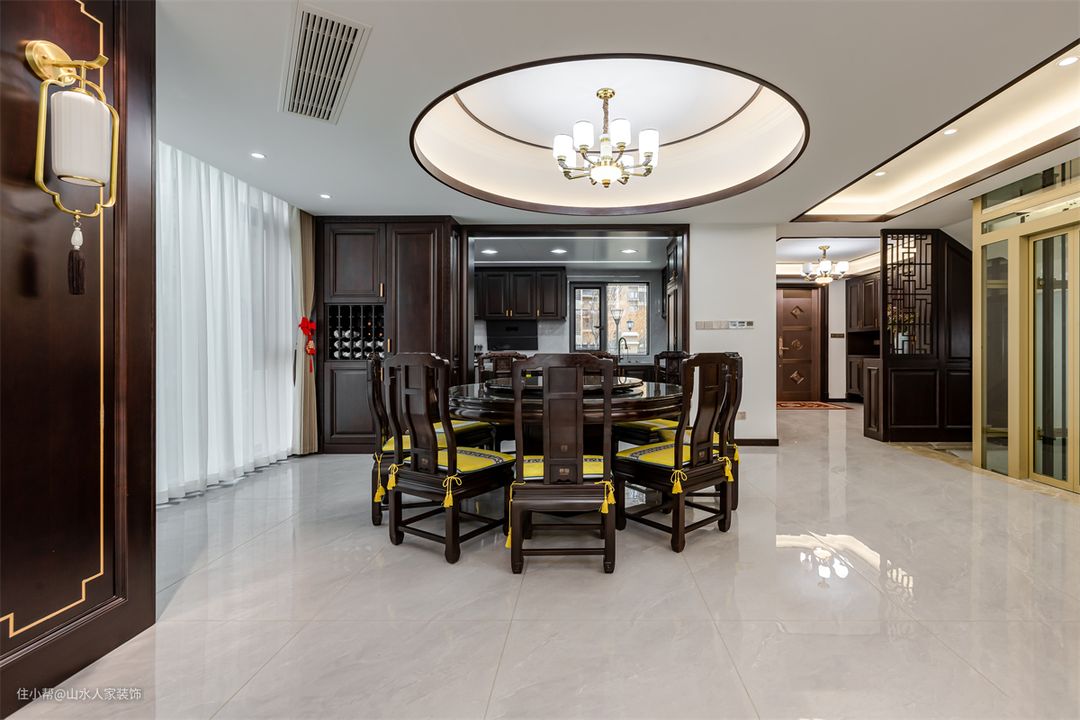 圆形吊顶设计,跟圆形的餐桌相互照应,给人一种象征团圆的意味。光如一汪清泉,流淌在端庄的方椅圆桌之间,凝结出中式的美感。没有繁杂的装饰,整体氛围更显温馨,从而为业主带来舒适愉悦的用餐体验。