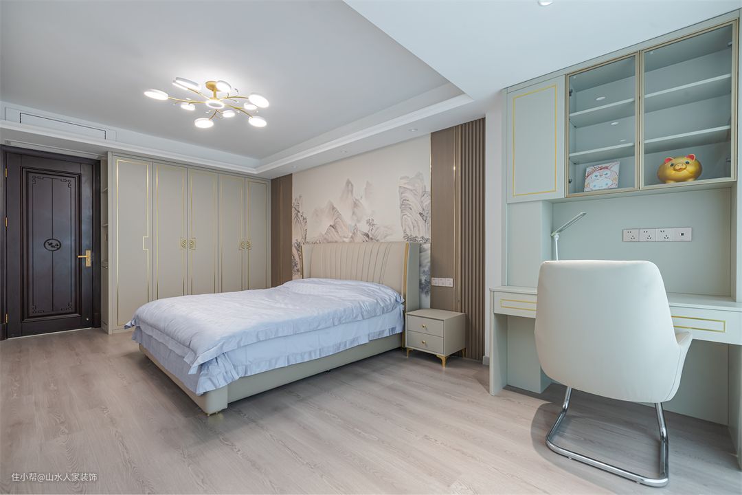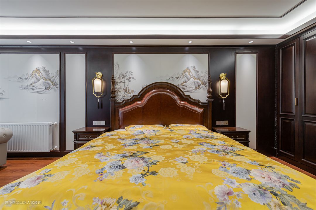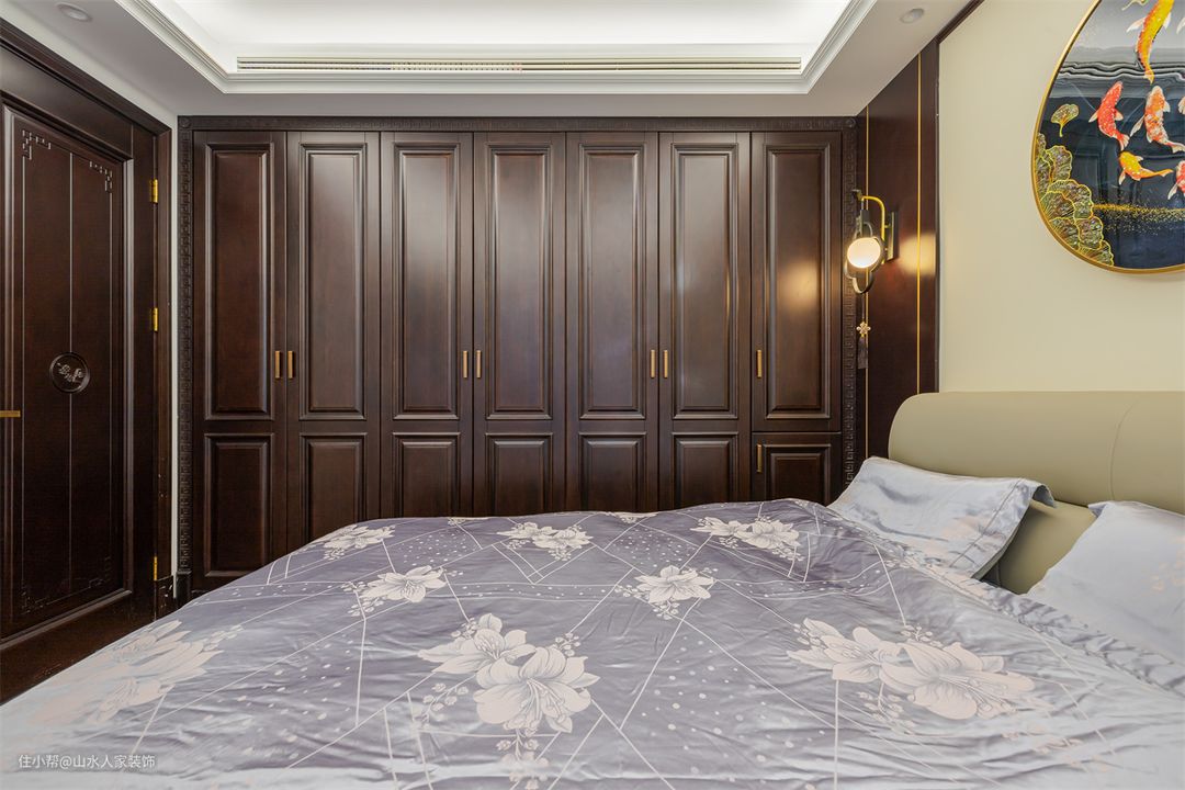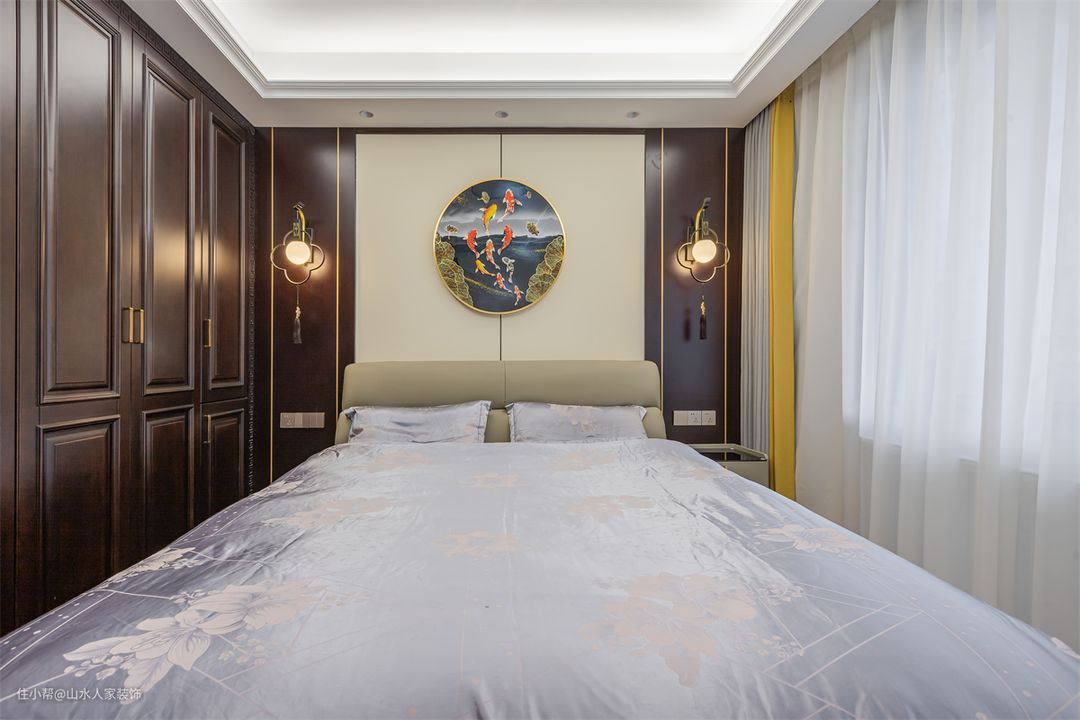 每间卧室都有着各自的主题,鱼儿在水中游,寓意“年年有余”,表达了业主对生活的殷切希望。整体用到墙板+木饰面的组合,搭配对称的中式吊灯,古风古韵,逸趣横生。