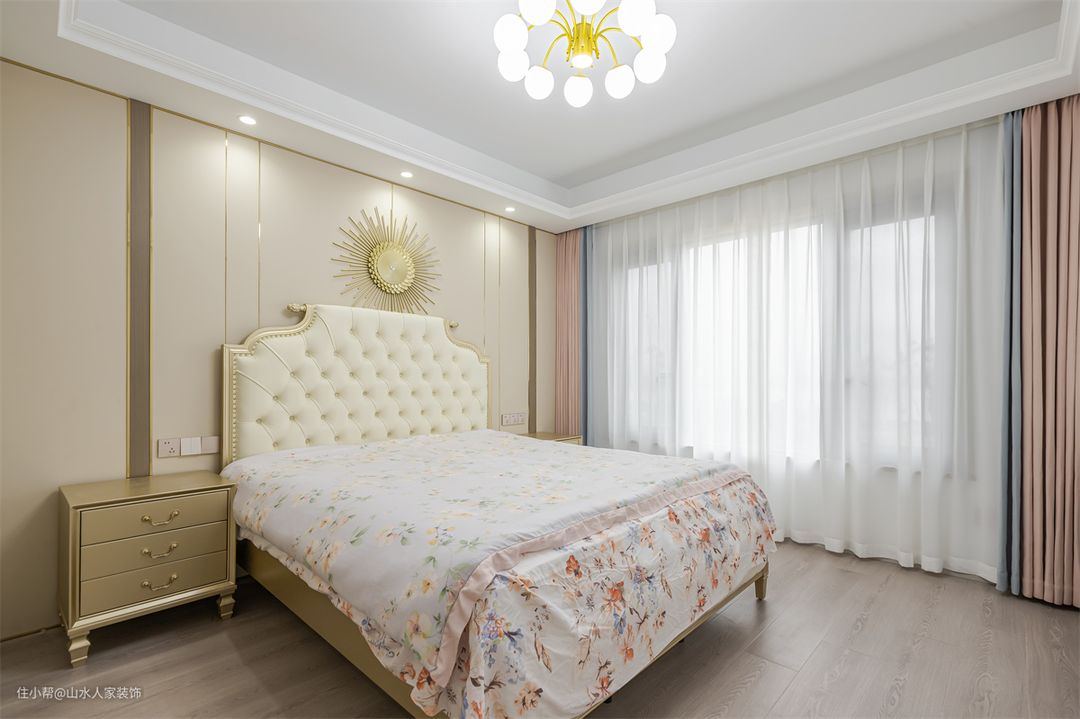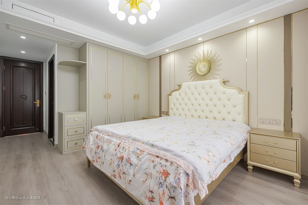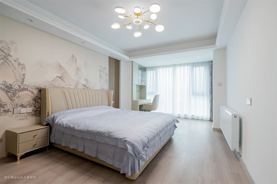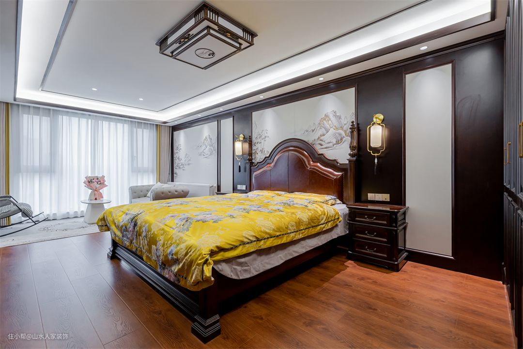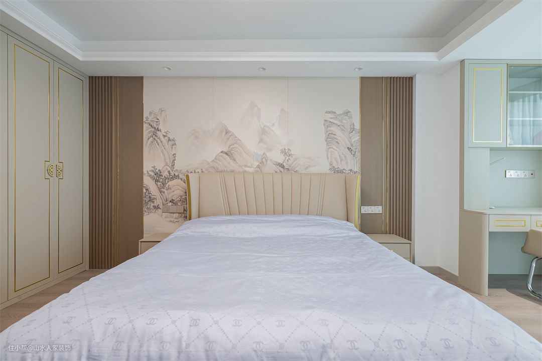 每间卧室都有着各自的主题,鱼儿在水中游,寓意“年年有余”,表达了业主对生活的殷切希望。整体用到墙板+木饰面的组合,搭配对称的中式吊灯,古风古韵,逸趣横生。