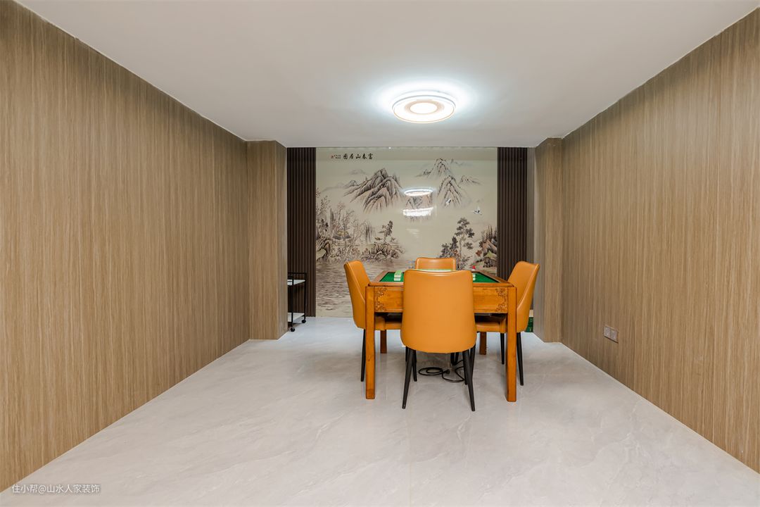 麻将房墙面大面积用木饰面包裹,整体氛围轻松柔和。麻将桌则借橘色作为撞色搭配,进而丰富了空间色调。大家休闲之时,玩上一两把,雅俗共赏,乐趣无限。