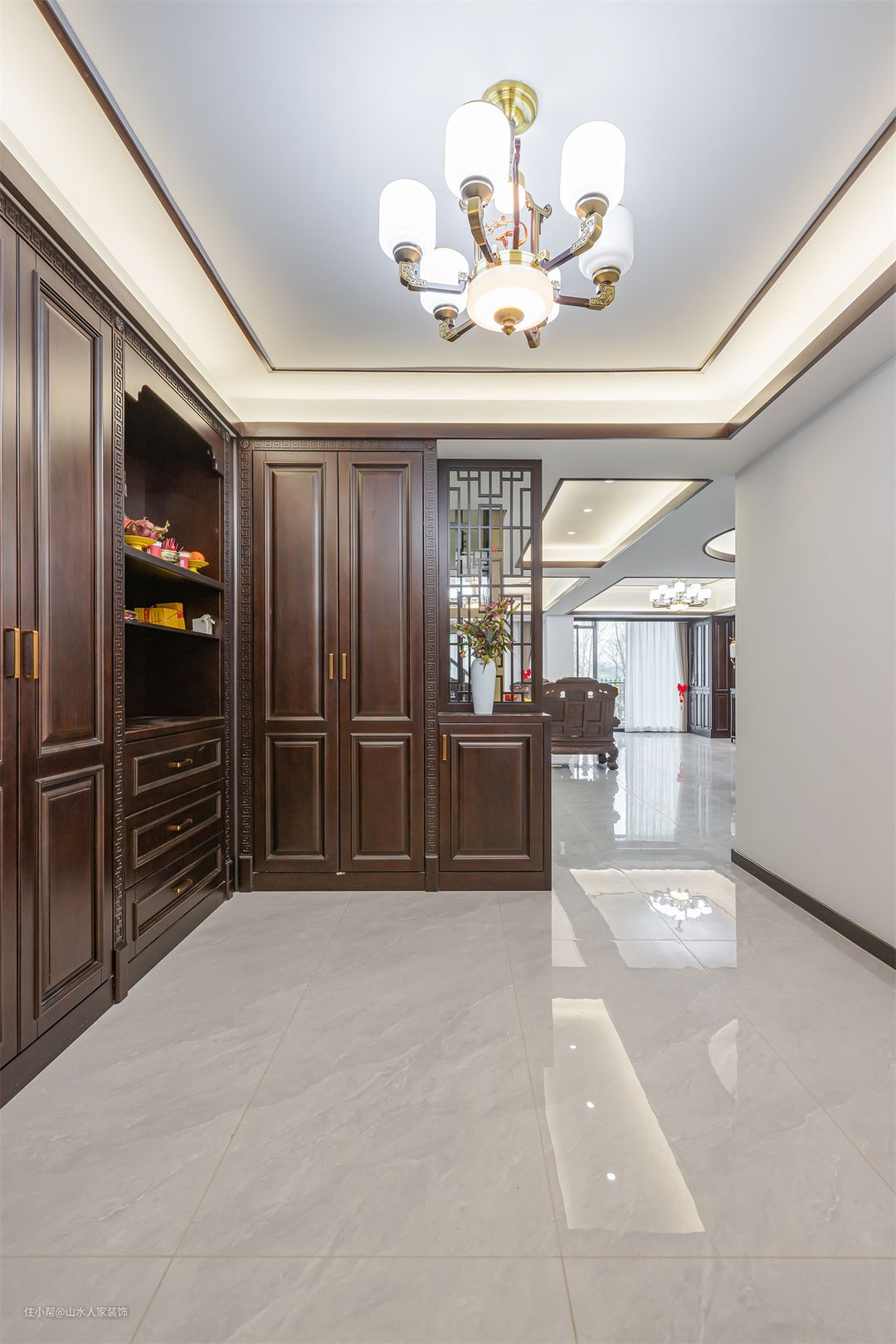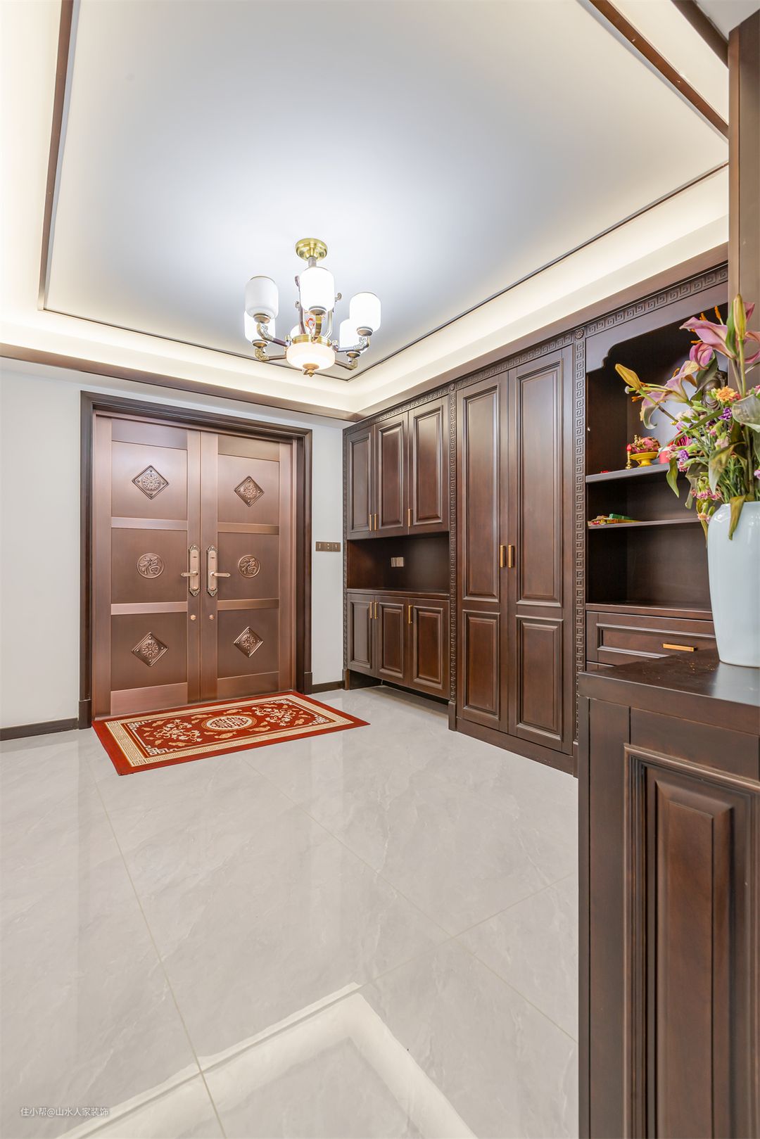 初进门,便能感觉一股木质气息的清香。门厅范围很大,结合中式吊顶设计,彰显沉稳的空间感。同色系入户门的选择,完美适配周围的生活环境,细节而不突兀。