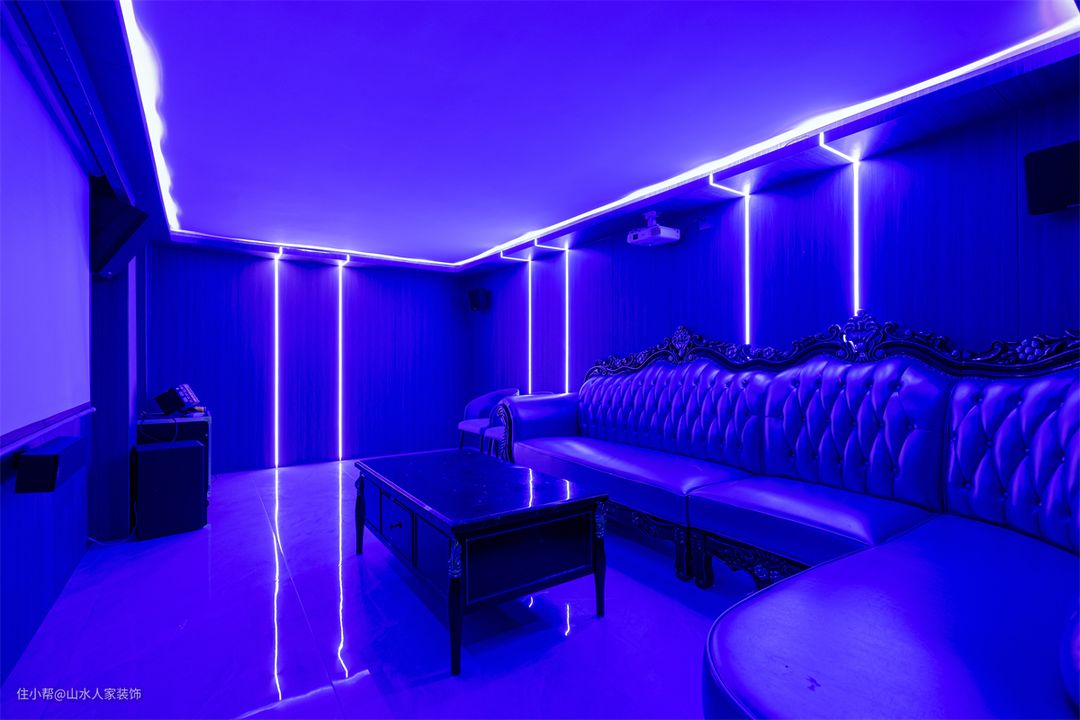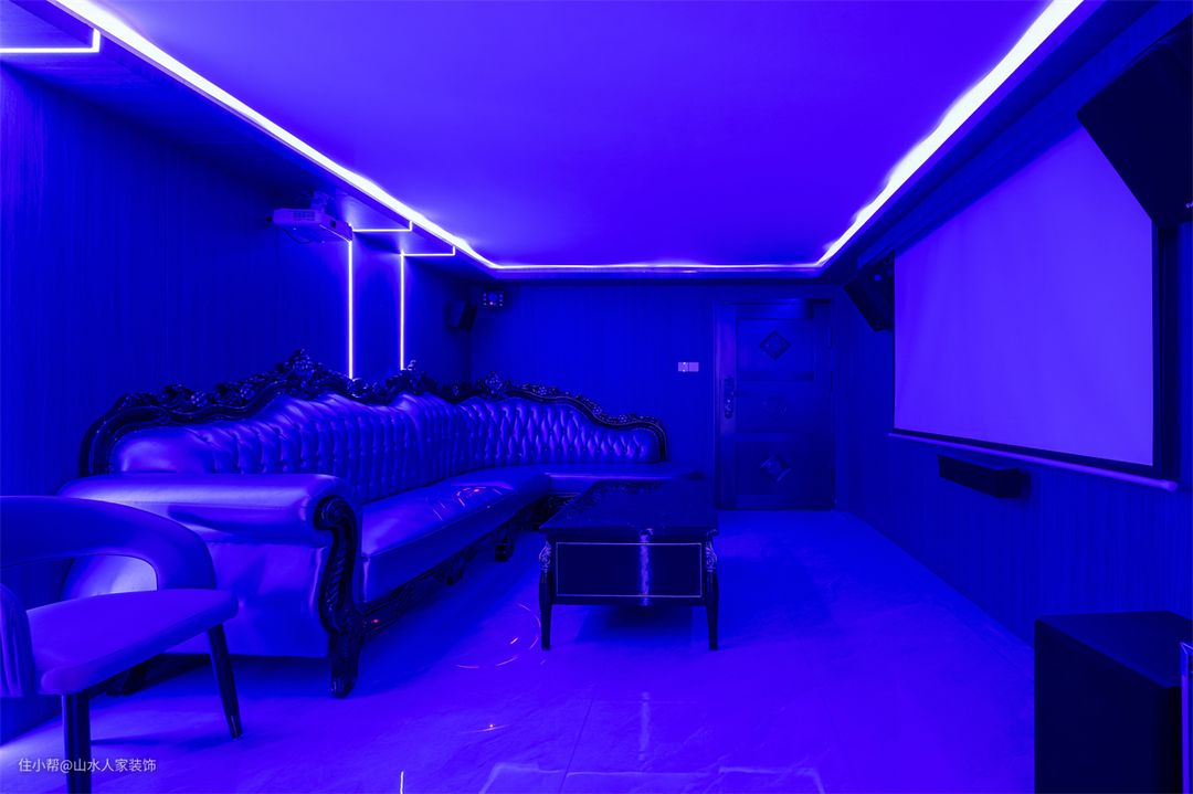 影音室对自然光线的要求不高,且考虑到隔音效果,所以设置在地下室。空间相对独立,内外景相互衬托,100寸的投影幕布墙再加上极致的灯光影效,给身处其中的人带来舒适愉悦的视听享受。