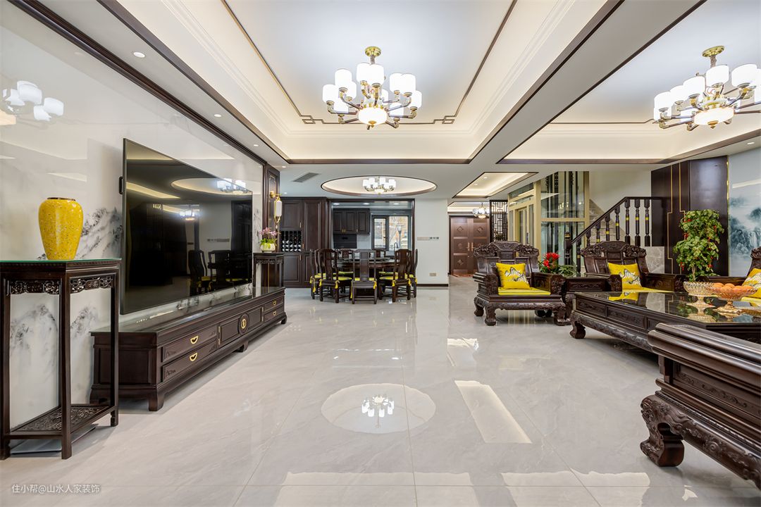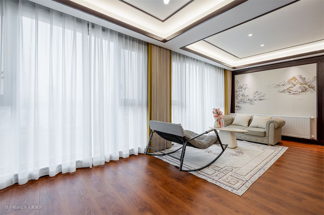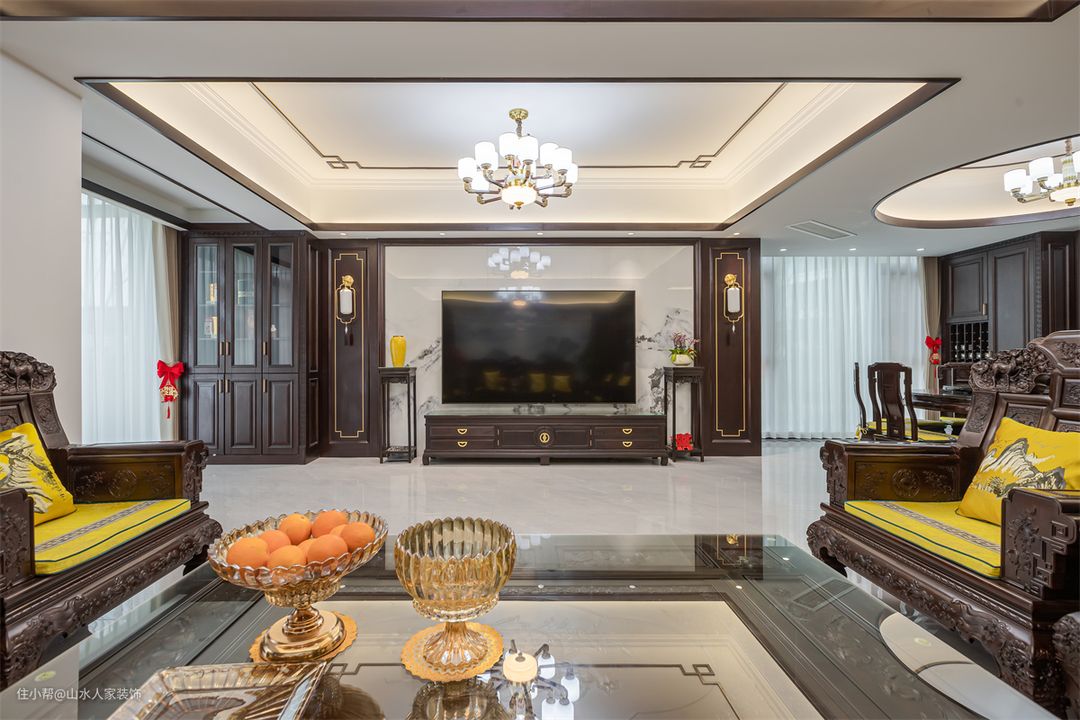 客厅背景主体是一幅经典山水画,意境悠远,云淡风轻。旁边还做了木饰面+线条的刻画,保留极强的生命亲和力。家具大多选用实木材质,色调柔和、韧性大,给人一种端庄大气的既视感。 水墨画电视背景墙是客厅装饰的点睛之笔,充分体察自然精神。搭配成品电视柜及花盆架,富含视觉感。蓬勃绿植和韵味摆件的组合,整体在迎合风水理论的基础上,渲染出更多的生机与活力。
