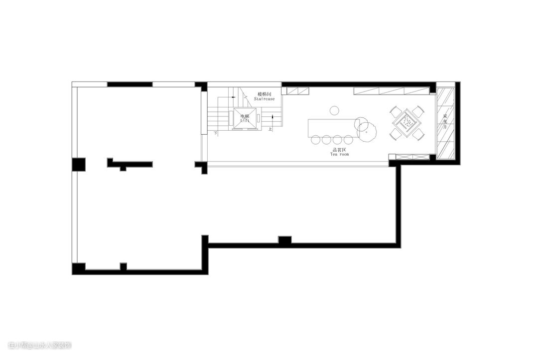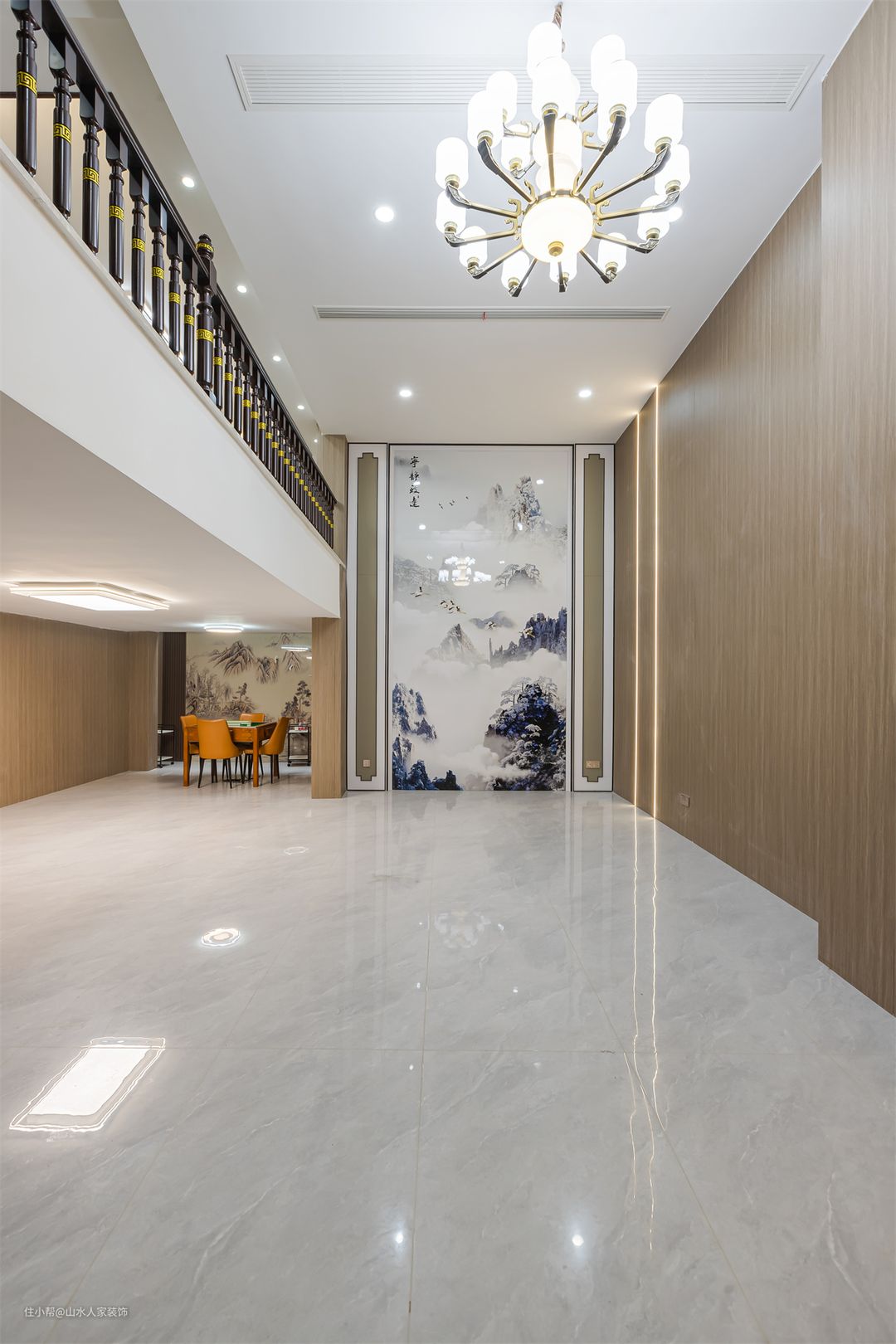 地下一层过道面积极大,中间部分挑空,视野格外开阔。另一边楼梯做了风格栈道,缓解层高的压抑感。通过用一幅秀美山水图充当空间装饰,既有远山的壮丽,又似有云雾的飘逸。