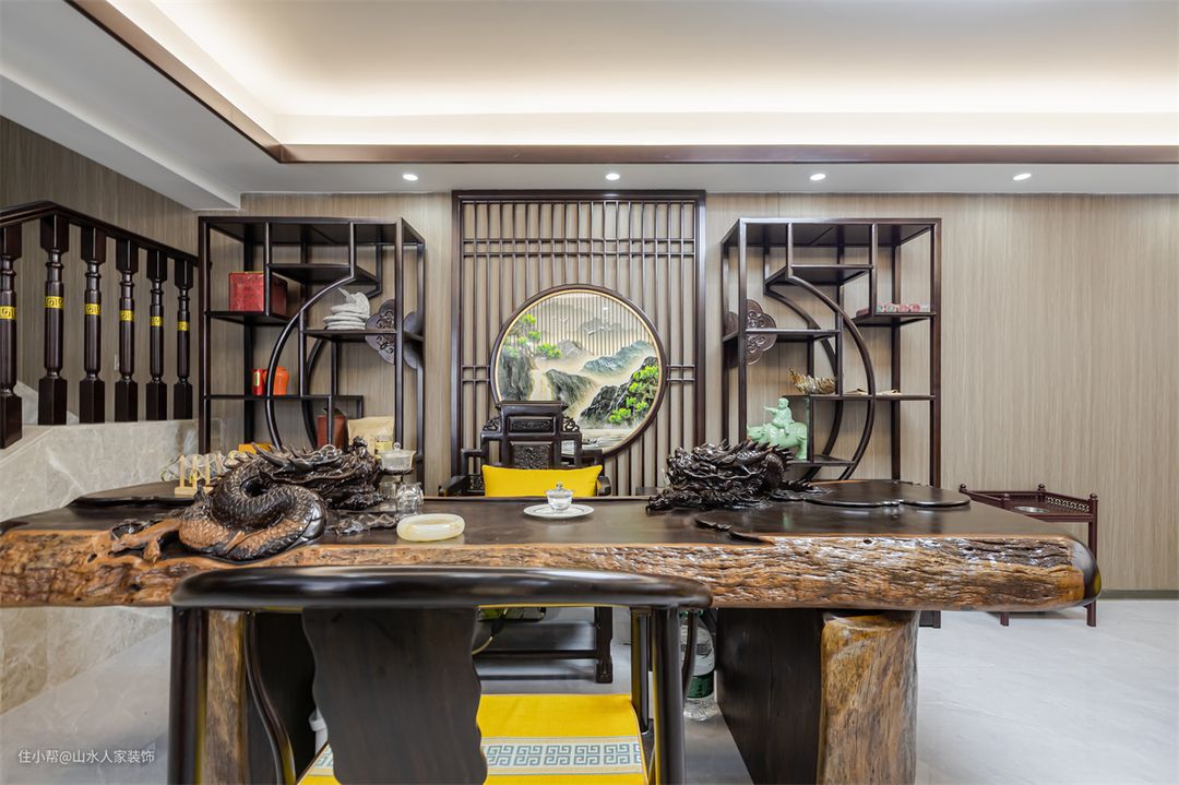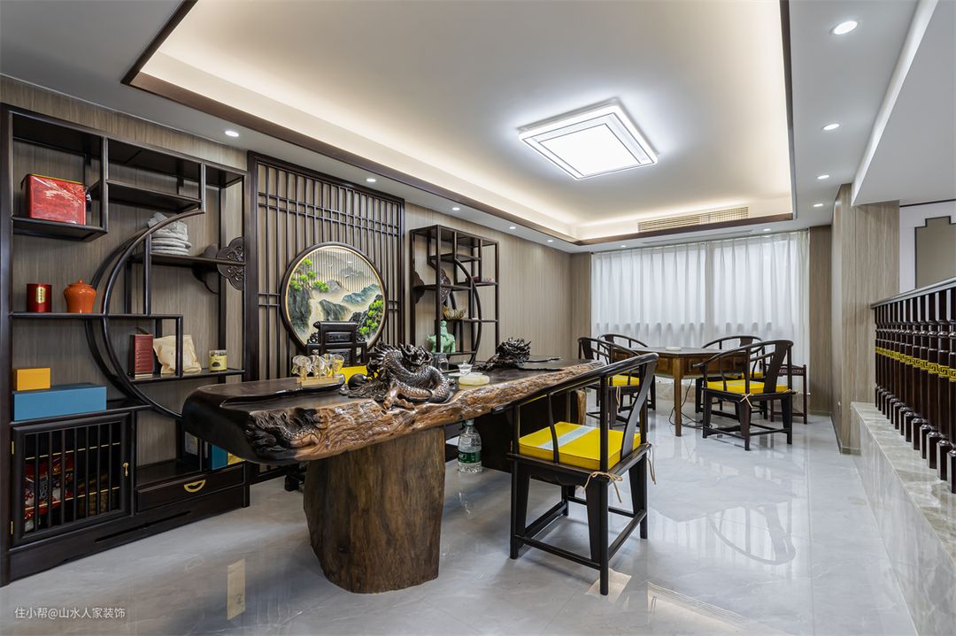 茶室空间设计独具匠心,充满了茶味悠然。茶桌的取材特殊,用到上好的树木,更能发挥醇香的茶性。红木博古架与古意茶具交相辉映,端庄而古朴,衬出东方文化的深厚底蕴。