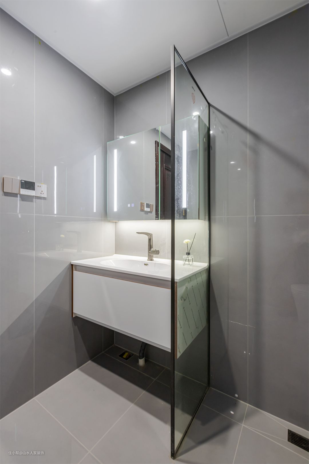 卫生间采用干湿分离的设计手法,设置了一个半隔断,有效实现分区,同时防止水溅到外面去。悬空浴室柜的安排,进一步缓解地面水流的压力,可搭配防水条使用。