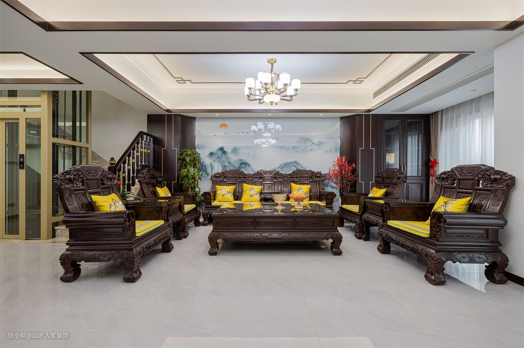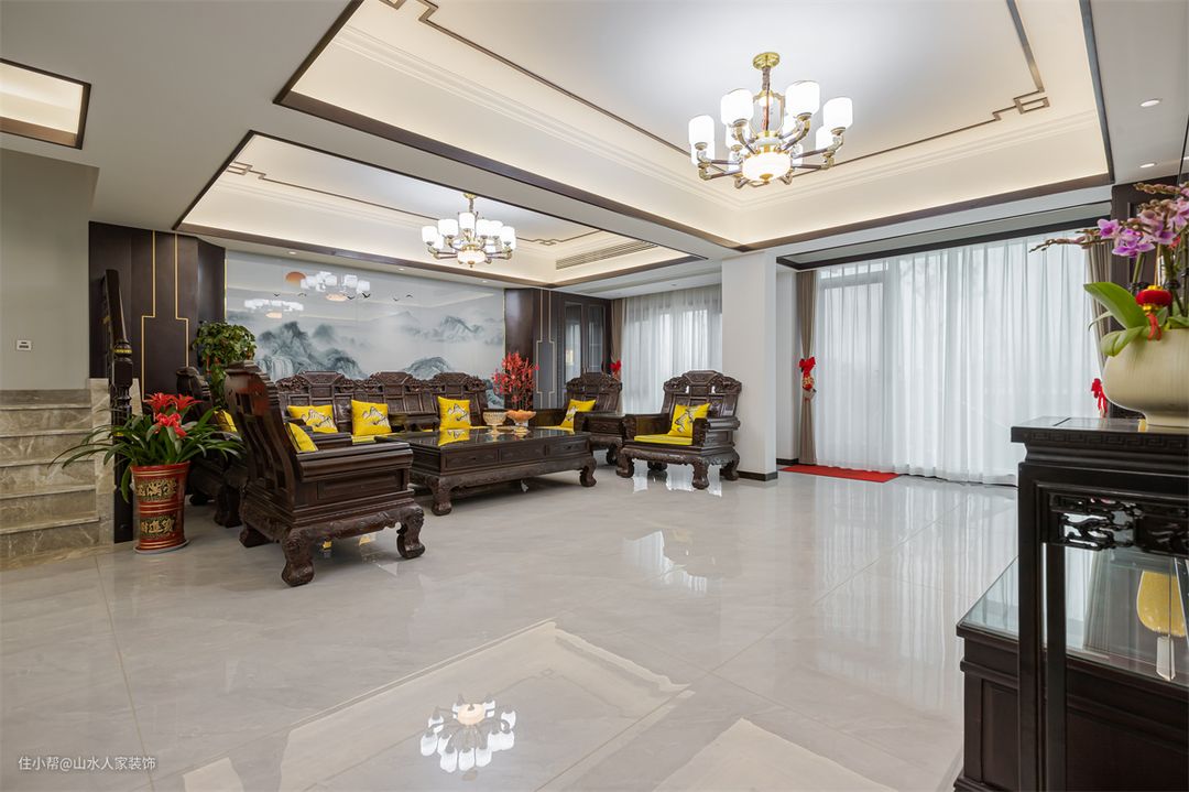 本案为500㎡的独栋别墅,业主是知识分子家庭,平时喜欢读书喝茶。他们希望自己的新家充满人文气质。而相较于传统中式的庄重沉闷,新中式更多的是保留中式的韵味,同时结合现代的设计感,产生一种难以言说的装饰魅力。由此呈现出的精致典雅空间,正是业主一家期待苛求的。借助于中式对称布局,方正的美感尽显空间的端庄与气势,再加上红木家具的点缀融入,使得整个空间兼具诗意与活力。 本案户型方正,南北通透,属于是独栋别墅,共有三层(包括地下两层在内,则为五层)。每一层都有着各自的专属功能,以此满足业主的实际生活需要。