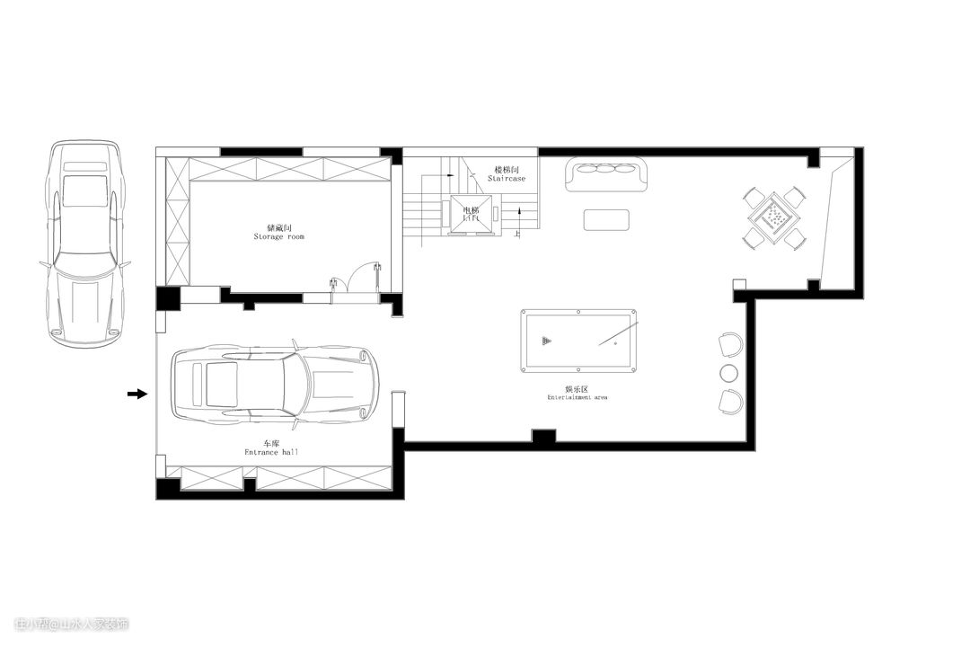 一层为公共生活区,包括客厅、餐厅、厨房在内,整体做成开放式结构,LDK一体,保留了优良的生活动线。 二层为休息区,合理布置了各个卧室,有效实现了动静分区。 三层为主卧休息区,整体做成套间样式,包括衣帽间、梳妆台在内,设计上注重舒适性和私密性。 地下一二层,主要规划了收纳和娱乐的功能。合理布置了麻将房、茶室和影音室等,更好满足业主的休闲娱乐需要。