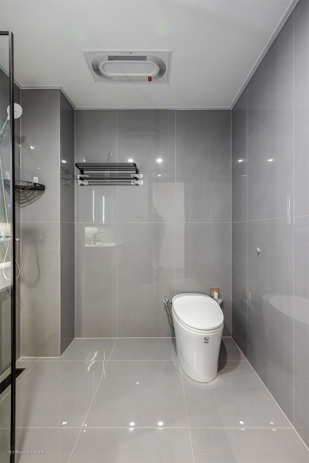 卫生间通铺墙地一体灰色砖,空间更显干净整洁。尤其是合理规划了马桶区和淋浴区的位置,整体的功能性大幅提升,视野更加通透,且洗澡不烦闷。
