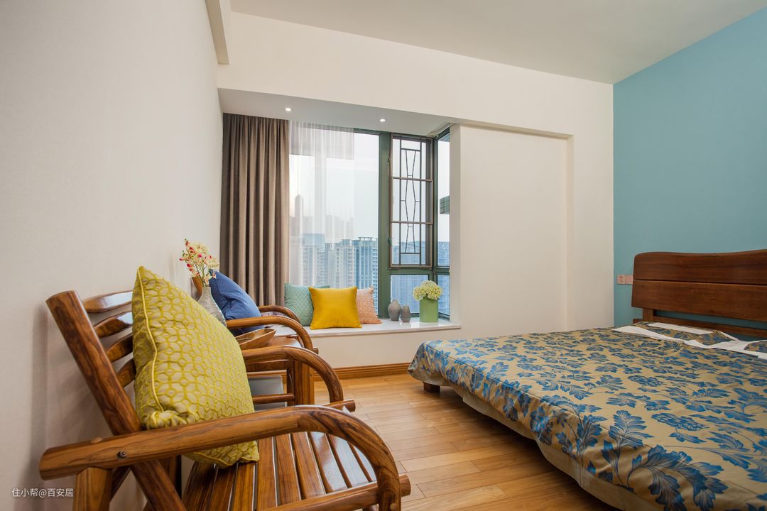 业主对于卧室的追求是舒适与宁静,但又想有个人的风格。飘窗上铺设了白色大理石作为台面,灰色窗帘,台面上加入了一些亮色系的抱枕,装饰性花瓶,还有一盆绣球花为卧室增添一丝活力和趣味性。实木家具的选用保障了卧室环境的健康与安全,采用米白色的墙面乳胶漆,并单独把床背景刷成湖蓝色,简单的搭配营造了安静放松的氛围。