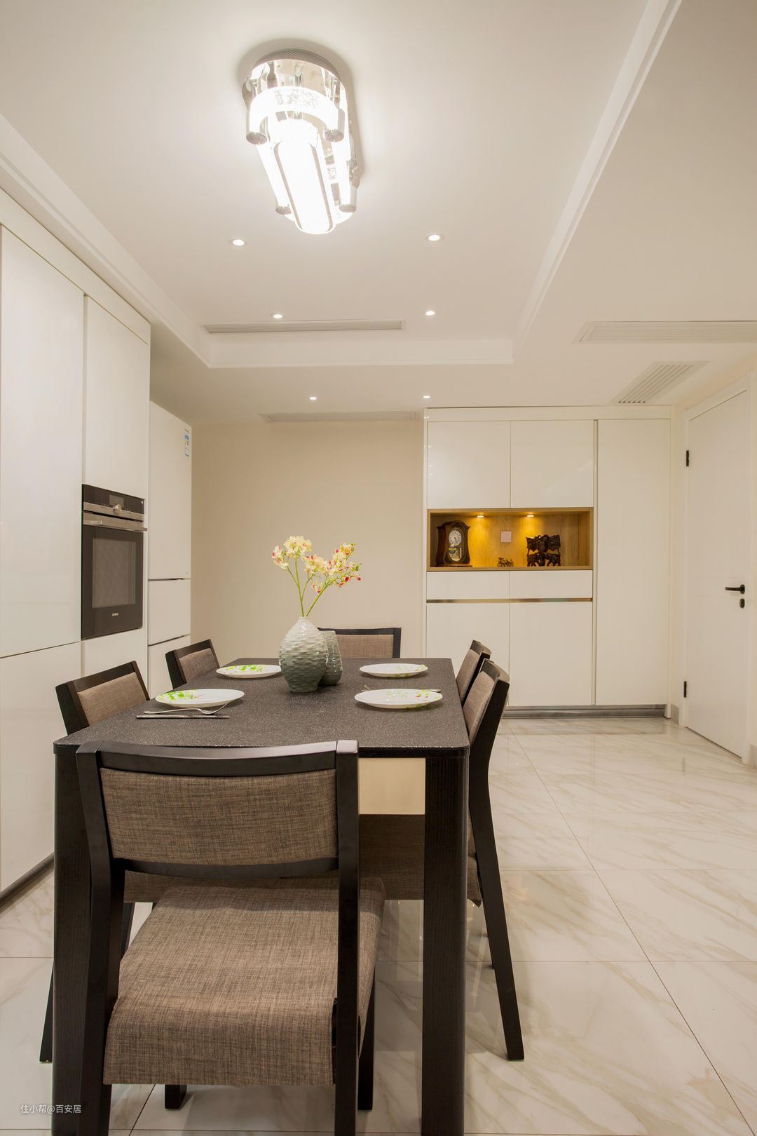 餐厨一体化的设计,是本案家居设计的一大亮点。走进他,你会被那种简约而不失格调,实用而不失美感的氛围所吸引。 实木餐桌椅居中摆放,餐桌是简约直线条款式,餐椅采用了布艺材料,质感柔软,坐感舒适,这样的家具不仅实用,而且能够提升整个空间的品质感。边烹饪边与家人聊天,既可以做美食又可以增进家人们的感情真是个不错的设计方案。