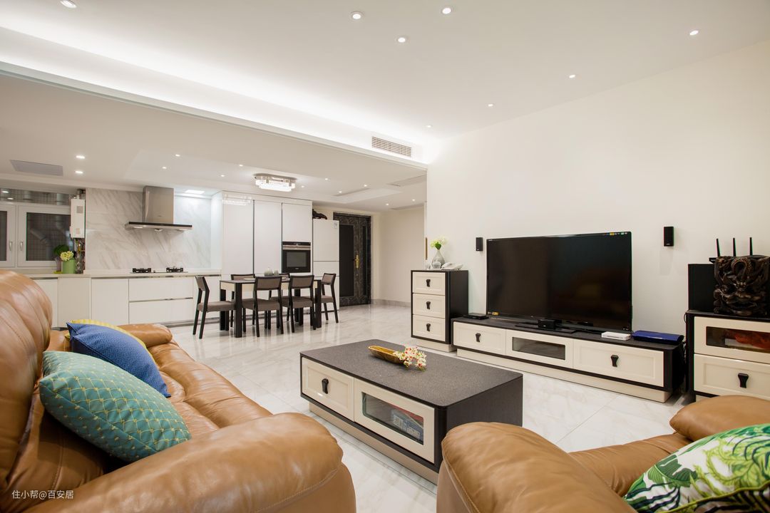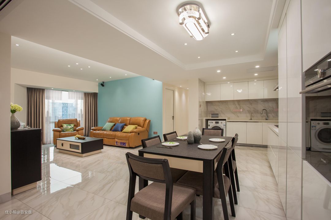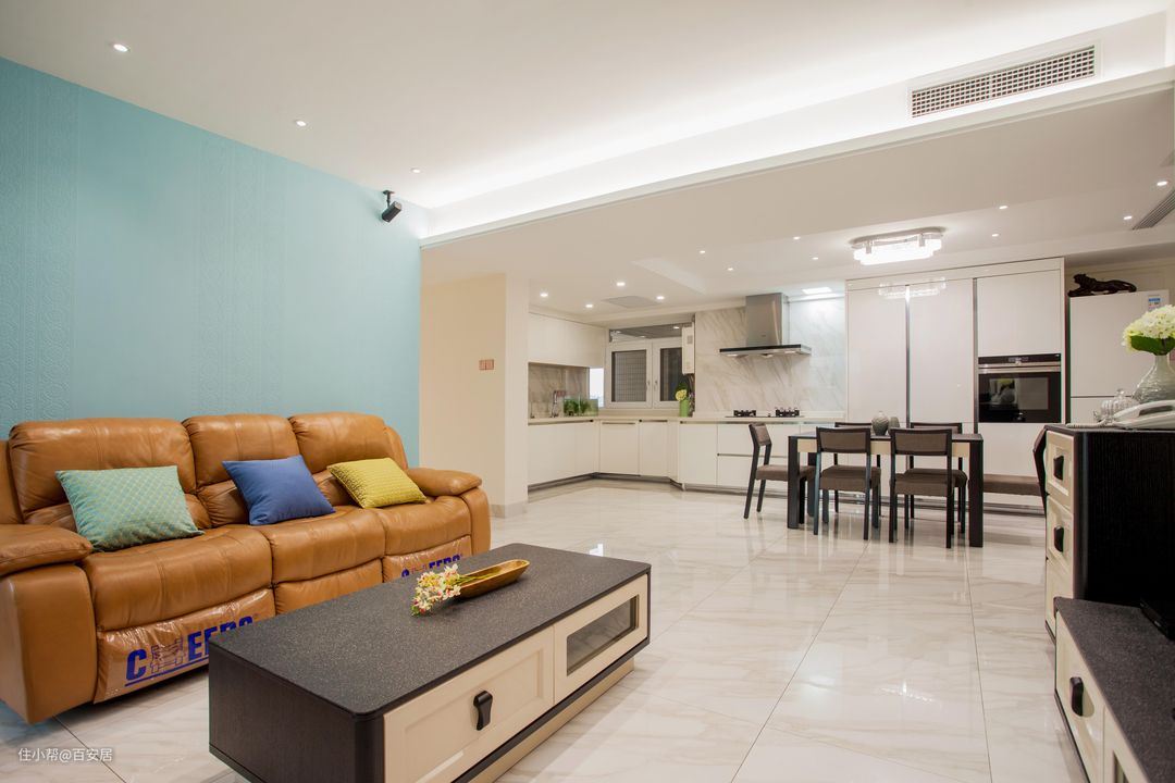 白色的整体色调,胡桃木与白色相拼接的家具,沙发背景刷了一个水蓝色的墙面漆,客厅营造出一种清新、宁静又充满现代感的居住空间。水蓝色这种色彩既不会过于刺眼,也不会显得过于沉闷,恰到好处地营造出一种轻松愉悦的氛围。当阳光透过窗户照射进客厅,水蓝色的墙面仿佛泛起层层涟漪,让整个空间都充满了生机与活力。在这里,无论是与家人围坐沙发聊天,还是独自一人品味一杯咖啡、阅读一本好书,都能感受到那份美好与舒适。