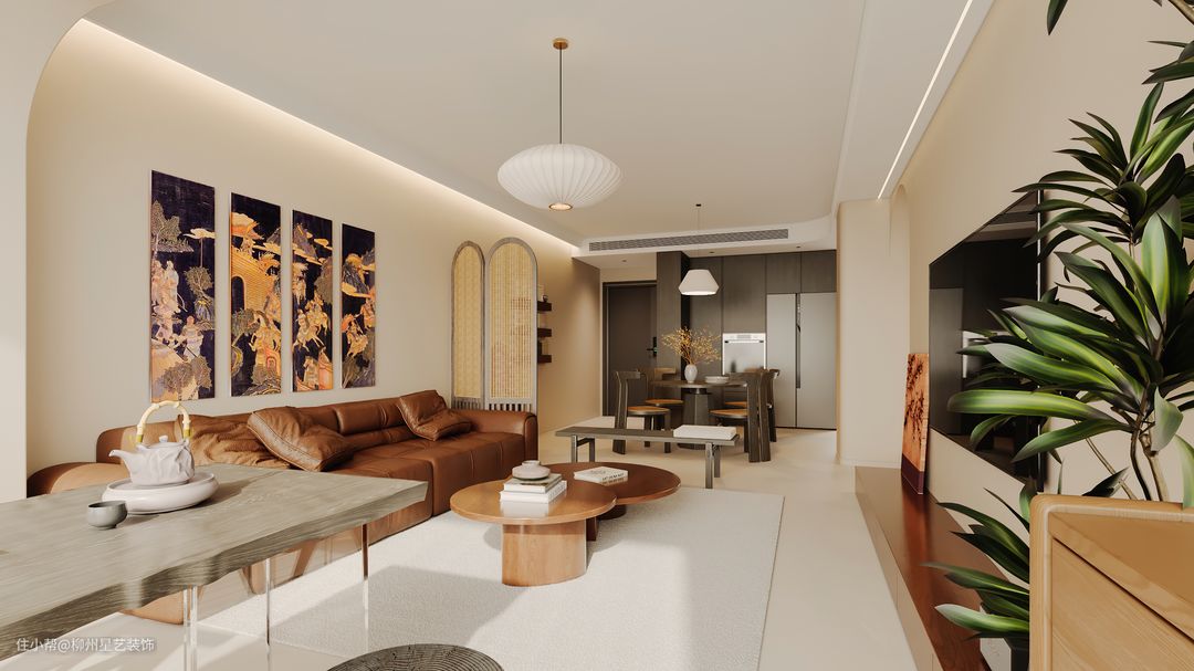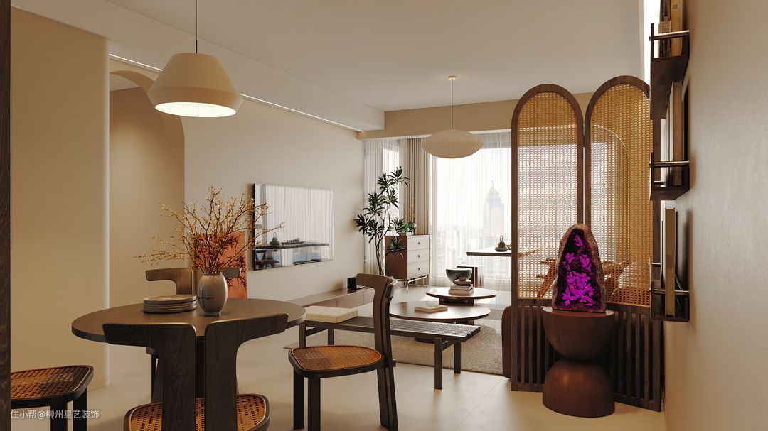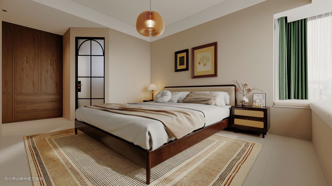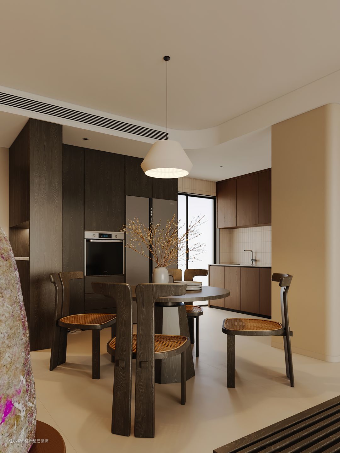 我们设计师将东方美学与西方摩登完美结合 以米色+棕色系为主基调 挑选深胡桃色木质板、藤编、绿植等元素 并从五感出发 塑造故事感、温馨感 电影般的空间感