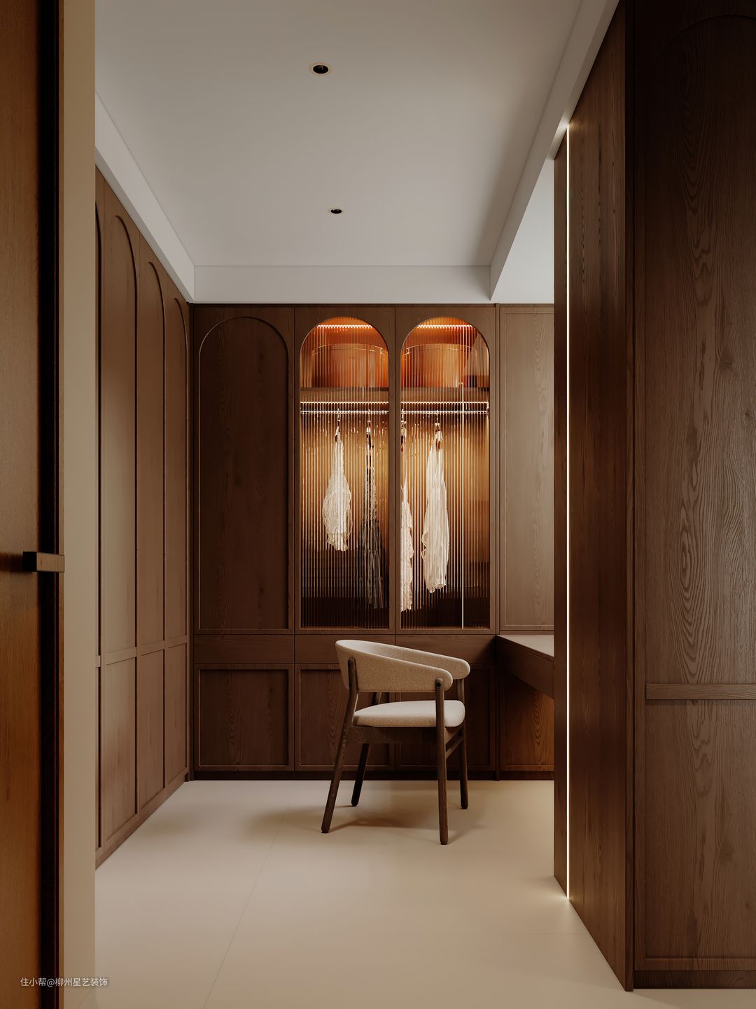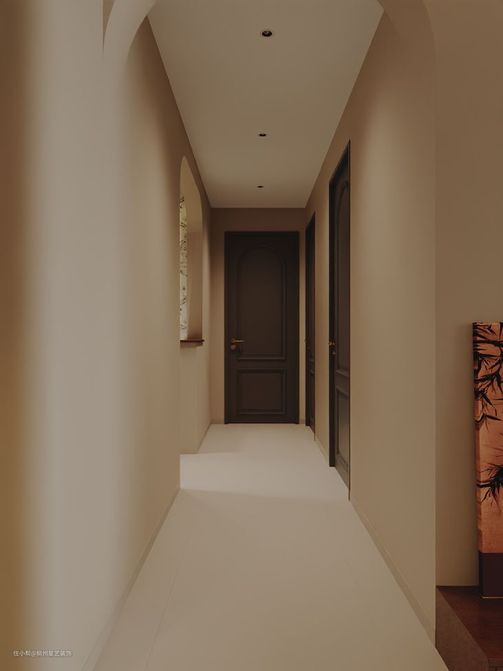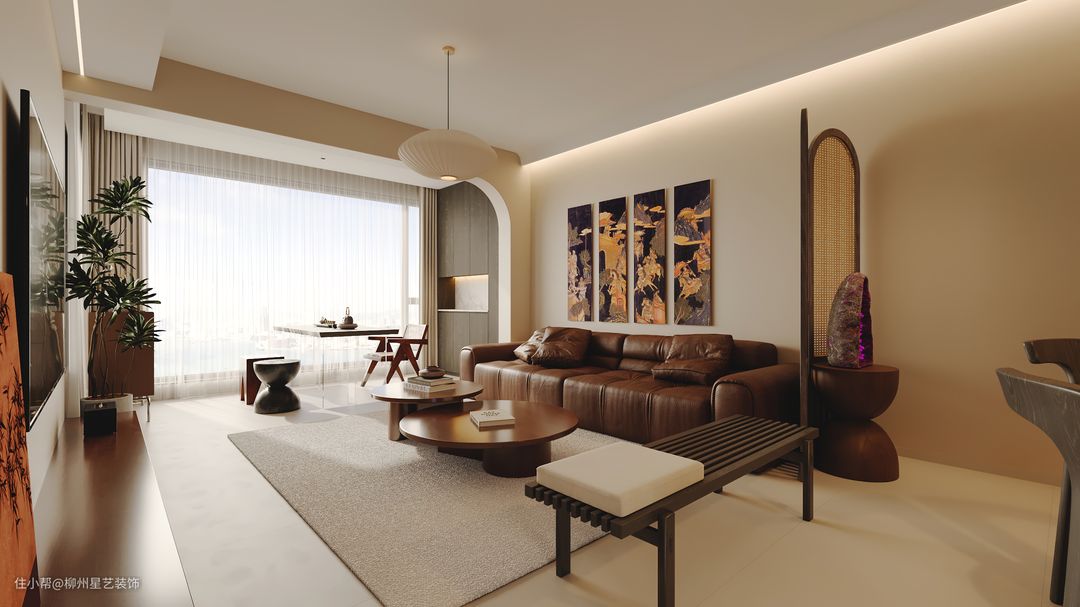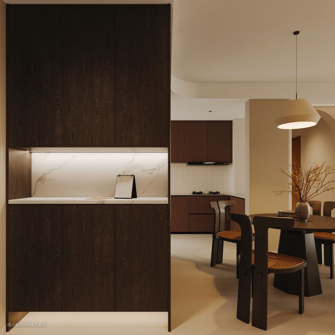我们设计师将东方美学与西方摩登完美结合 以米色+棕色系为主基调 挑选深胡桃色木质板、藤编、绿植等元素 并从五感出发 塑造故事感、温馨感 电影般的空间感
